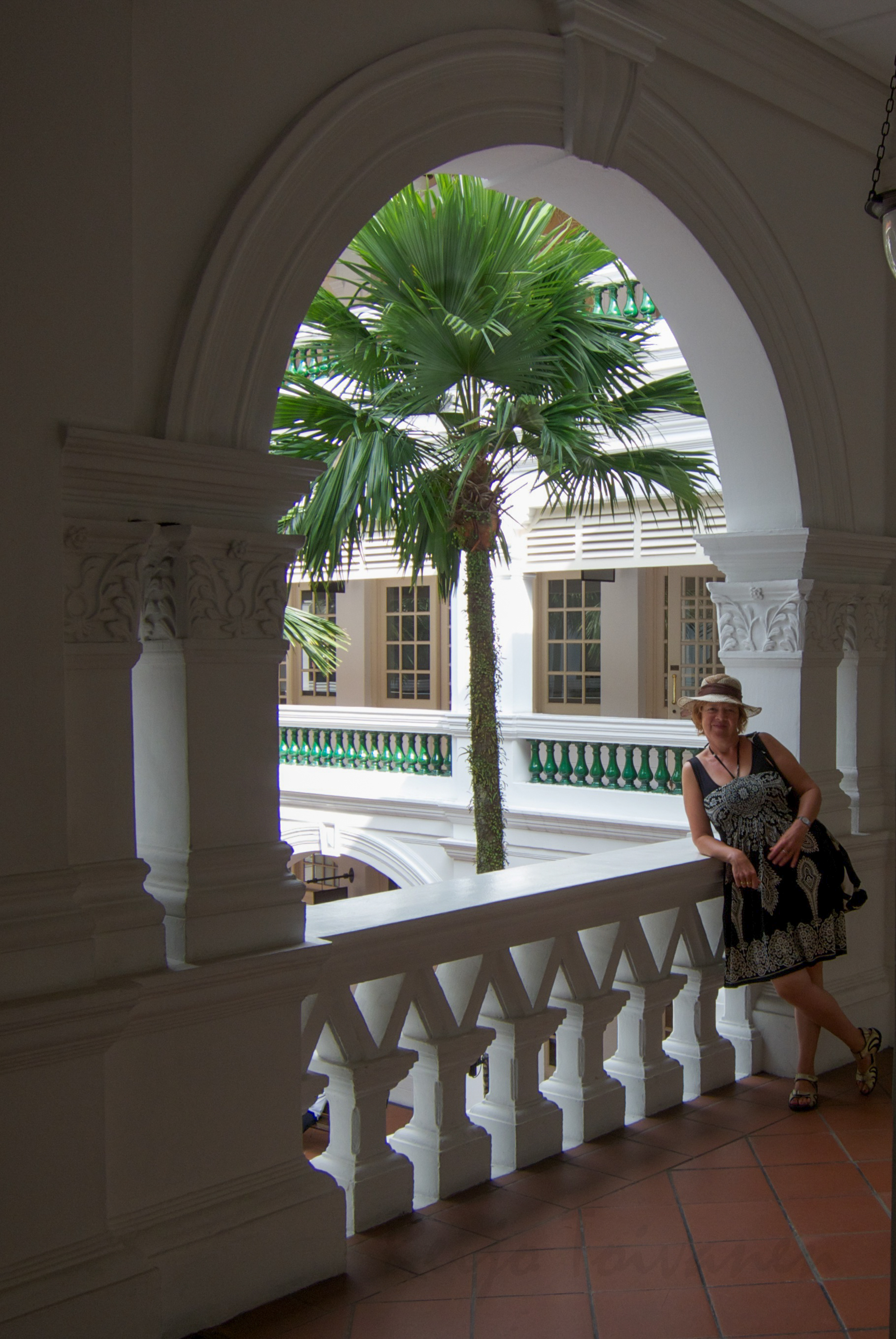 Raffles-hotelli on Singaporen historiallinen nähtävyys. Siellä me kävimme taas juomassa Singapore-Slingit, tällä kertaa pitkässä baarissa toisessa kerroksessa. Lasillinen maksoi runsaat 30 paikallista dollaria eli parisenkymmentä euroa. Puolet hotellista on muutettu ostoskeskukseksi ja toinen puoli jatkaa viidentähden hotellina.