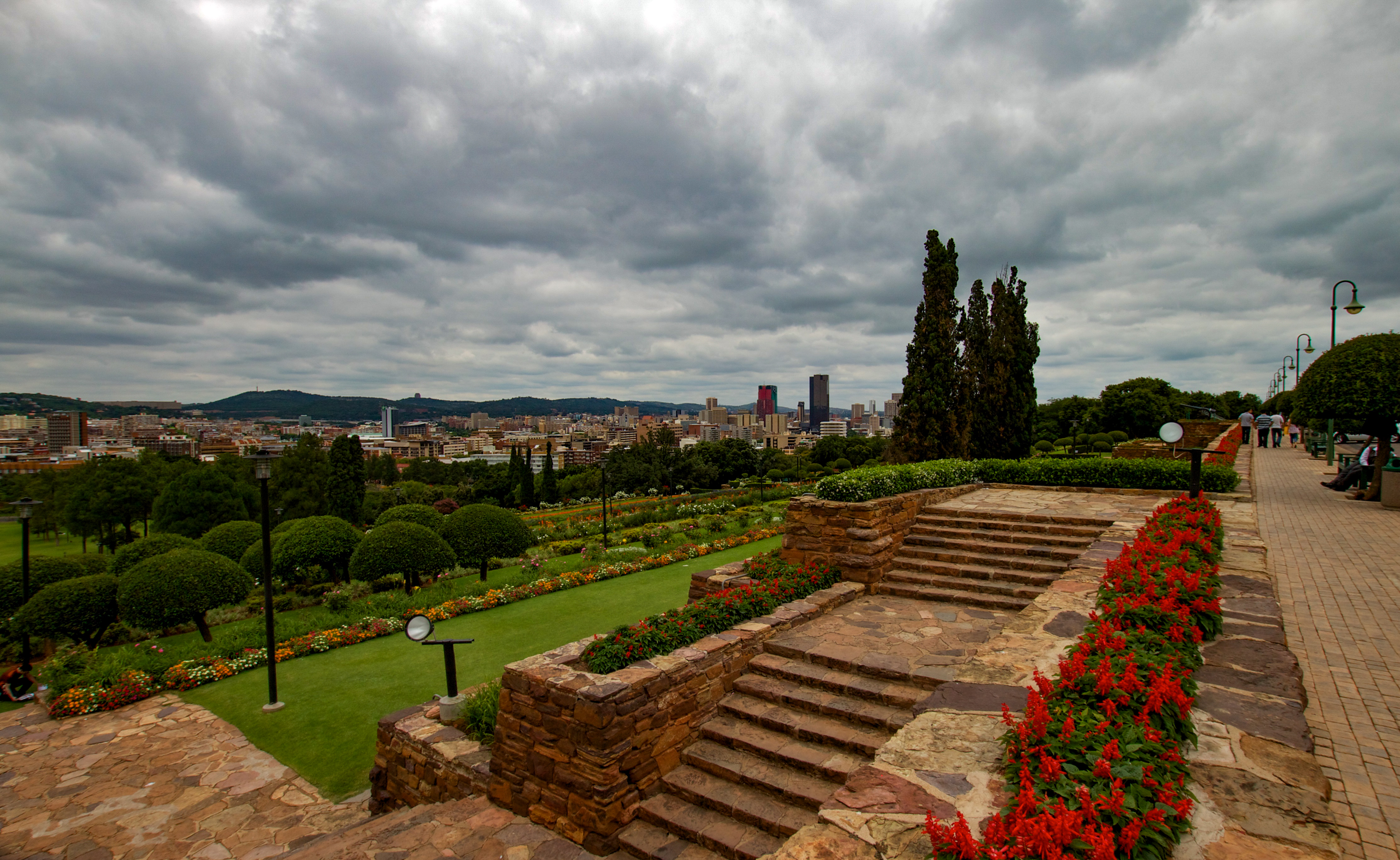 Ken ehti ajeluttaa meitä Johannesburgin keskustassa jos silloin, kun odottelimme Juliaa Euroopasta. Tällä kertaa Ken vie meidät panssaroidulla autollaan ensin Pretoriaan, Etelä-Afrikan pääkaupunkiin, jonne on yli 40 km ajomatka. Puisto hallintorakennusten edustalla on brittiläistyylinen, on ruusuja, nurmikkoa ja pensaskäytäviä, jotka päättyvät patsaaseen tai lammikkoon.