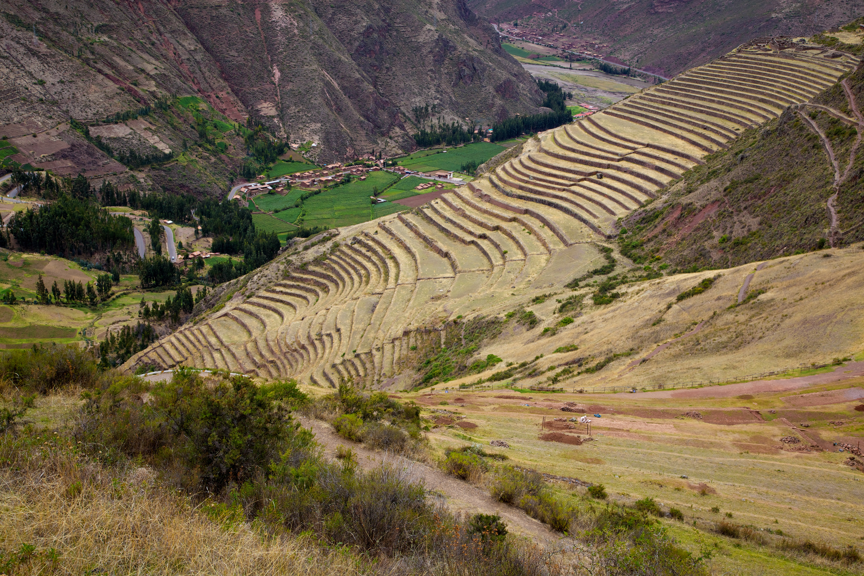 Matkalla Cuscosta Machu Picchulle vain parin tuhannen metrin korkeudessa on laakso, jonka rinteillä oli inkakaupunki nimeltä Pisaq ja yhteensä seitsemän sataa pengerrettyä peltokaistaletta. Niitä tutkittaessa on saatu selville, että inkat jalostivat viljelykasveja eri tasoilla, eri mikroilmasto-olosuhteissa. Ylimpänä kasvatettiin perunaa, seuraavalla tasolla maissia ja alimmilla terasseilla muita vihanneksia ja hedelmiä, joiden siemeniä ja juurakoita inkat kantoivat viidakosta. Maita tutkittaessa on saatu selville, että inkat käyttivät lannoitteina alpakan ja laaman lantaa. Suomessa peltojen lannoittaminen aloitettiin vasta 1700-luvulla. Nyt inkojen terassipellot ovat arkeologista tutkimusaluetta. Niissä ei viljellä mitään. Kuinka komeilta rinteet näyttäisivätkään erilaisten ja eriväristen kasvien peittäminä.