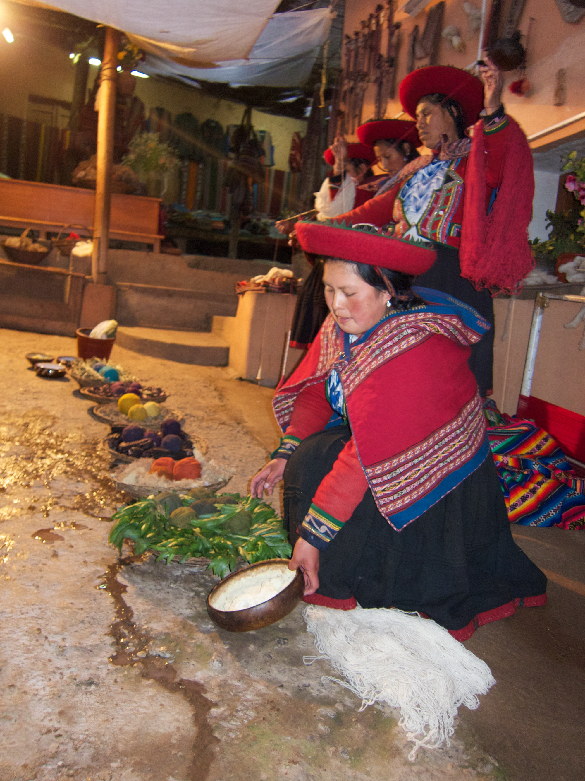 Kiertoajelumme vei meidät paitsi läheisiin rauniokaupunkeihin niin myös yhteen multatiilitaloista. Siellä esiteltiin kuinka alpakan villasta saadaan värikkäitä lankoja. Satoi. Cuscossa sataa usein. Talon sisällä oleva atrium-piha oli katettu muovilla ja pärskeet sieltä täältä valuivat vierailijoiden niskaan. Villakudonnaiset oli peitetty hyvin ja myytävää oli paljon.