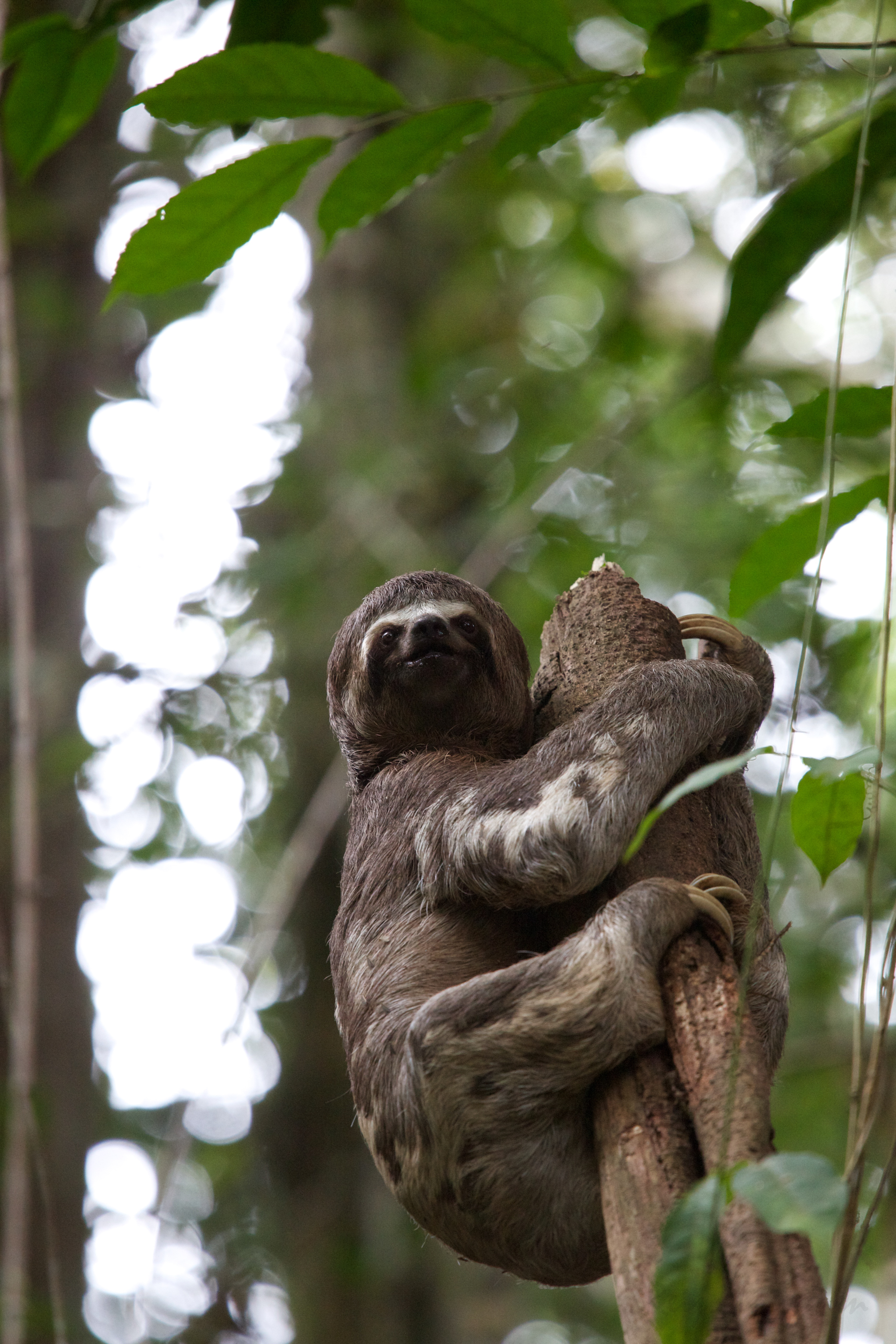 Ensireissulla viidakkoon näimme laiskiaisen. Tuskin olisimme sitä erottaneet ilman opasta, sillä se oli maastoutunut puun kylkeen. Jos vihreä väri on laskiaiselle edullista, se kelluu joessa niin kauan, että saa turkkiinsa leväpinnan.