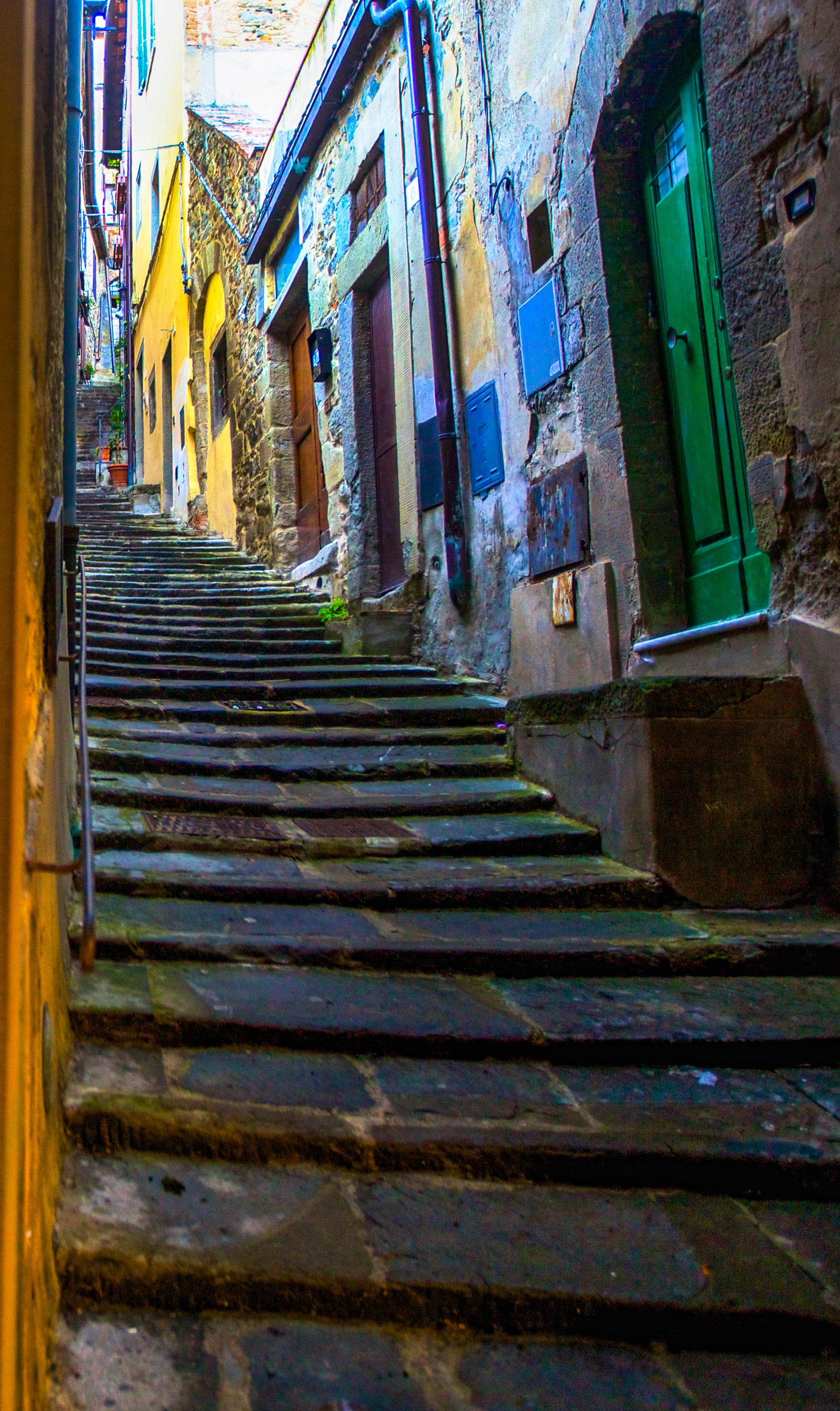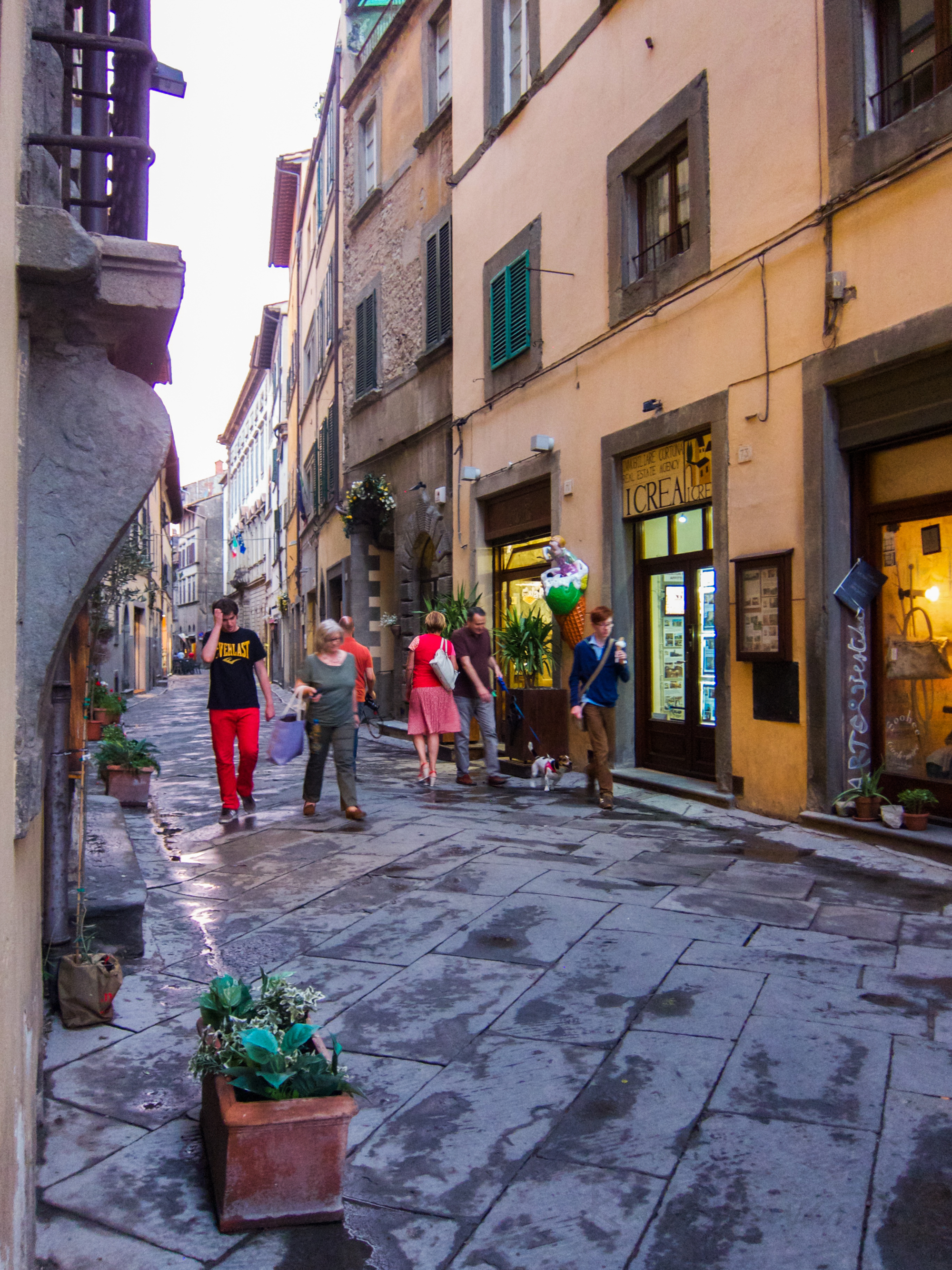 Cortona on pikkuinen paikkakunta, 600 metriä korkealla kukkulalla. Se on alkujaan etruskikaupunki. Kadut ja kujat kertovat historiasta museota elävämmin. Vanhat rakenteet näkyvät kiviseinissä, pohjimmaisina etruskien hakkaamat kivet, niiden päällä roomalaisten tiililadonnat. Kaupunki tuhoutui goottilaissodissa 500-luvulla, mutta kiviseinät kasattiin uudelleen, pystyyn jääneet rakenteet leivottiin uusien sisään. Ikkuna- ja oviaukkojen paikat näkyvät, ne kun on muurattu umpeen tiilillä ja kivillä, koska entiset aukot eivät soveltuneet seuraavalle sukupolvelle. Jotkut kujista ovat niin jyrkkiä, että alastulo kiilakorkoisilla kengillä saa polvet tutisemaan.