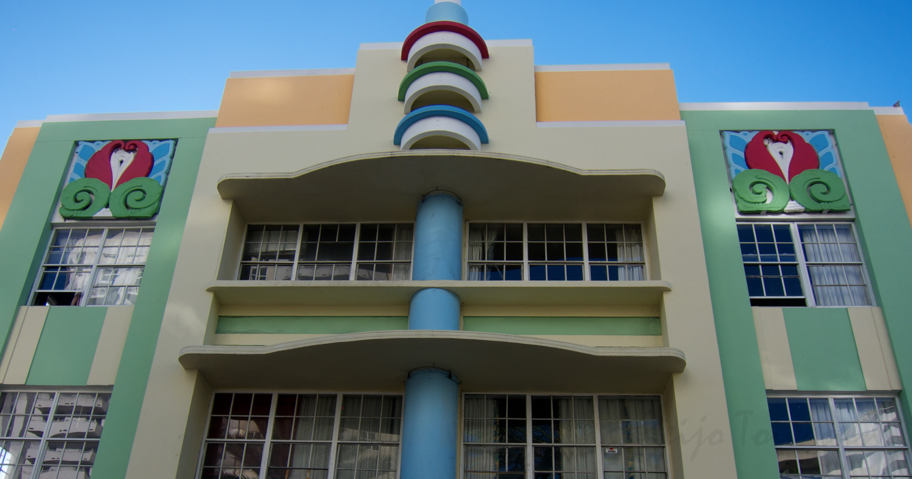 Miamin South Beachilla kannattaa tutkiskella Art Deco –rakennustaidetta. Se on noussut maailmasotien välissä. Kahdeksankymmentäluvulla taloja alettiin entisöidä ja tänä päivänä geometrisia kuviot ja murretut värit hivelevät silmää joka nurkasta. Viimeksi yövyimme aivan keskustassa, Gianni Versacen talon kulmilla. Se on jälleen kerran syyskuussa vaihtanut omistajaa. Joku hullu ampui Giannin talon portille kymmenisen vuotta sitten, kun hän palasi kotiin viereisestä ranskalaisesta ravintolasta. Giannin hankkimat käsin tehdyt huonekalut, tunnettujen taiteilijoiden maalaamat taulut ja freskot ja marmorista veistetyt patsaat ovat talossa edelleen, joten luksusmatkaajat saavat kohta nauttia sinne perustettavasta hotellista. Madonnan (joskus) omistaman hotellin Delanon muotokieli vastaa täydellisesti Art Decon määritelmää, usein merkityksettömät käytävät ja kulmat on muotoiltu tilataiteeksi. Naistenlehtien mukaan Madonna tulee välillä muutamaksi päiväksi Delanoon ja ottaa koko hotellin haltuunsa.