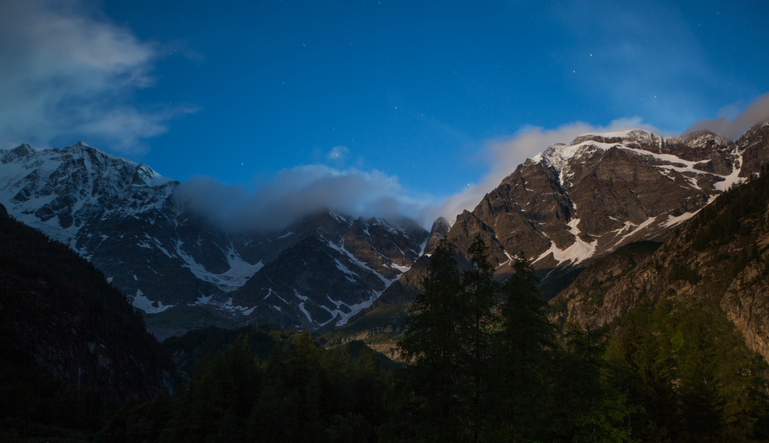 Allakka ennustaa ennätyskuutamoa. Emme ole ennen yöpyneet Macugnagalla, koska kuudenkymmenen kilometrin matka on taittunut helposti laskettelun jälkeen. Alppihotelli Dufour yllättää taas positiivisesti, voisin huolia melkein joka esineen ja tyynyn kotimme koristukseksi. Parvekkeelta näkyy rotkojen ja vuorten rivistö ja alla solisee Anza-joki.