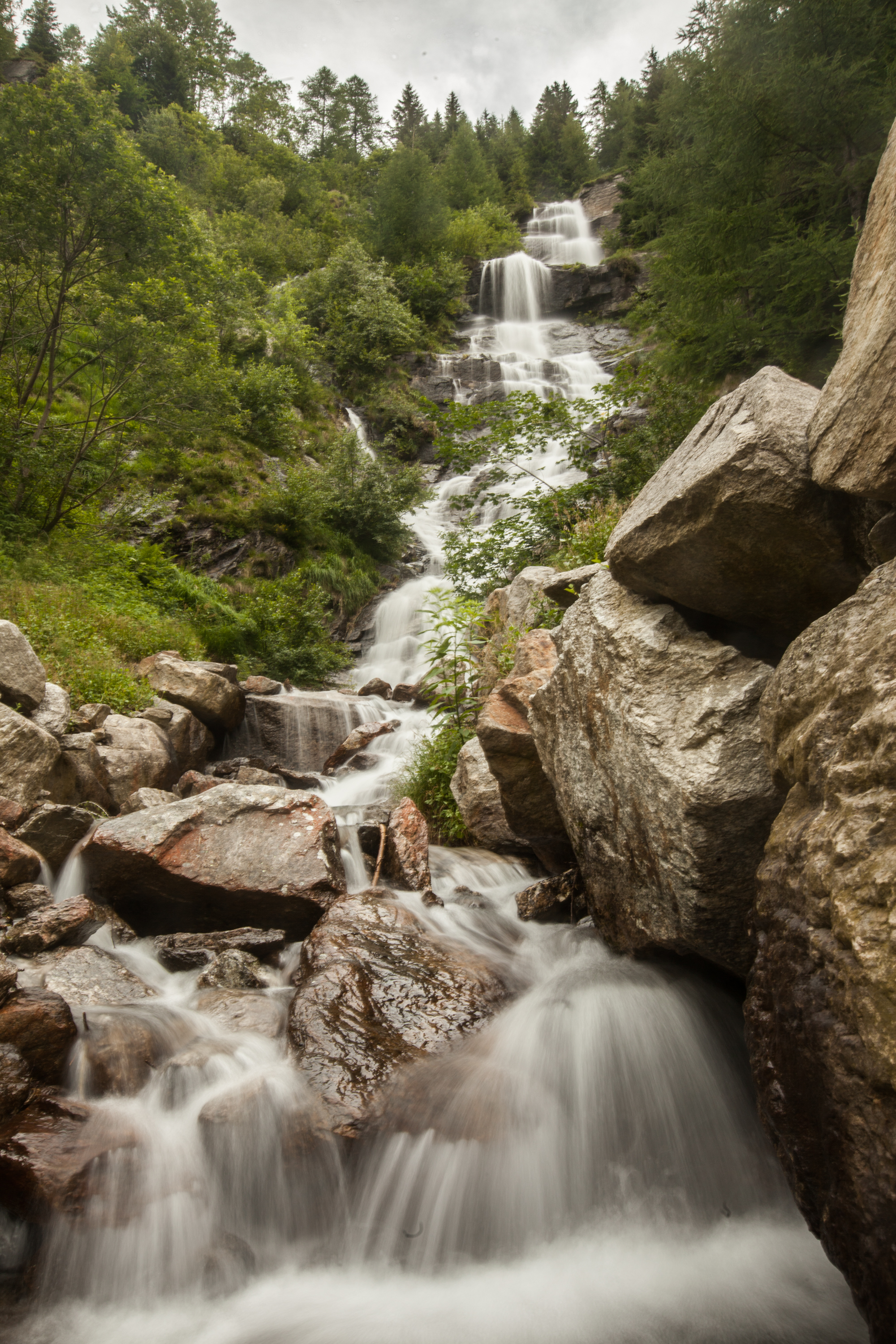 Kesällä vesiputoukset erottuvat hyvin maisemasta. Hotelliemäntämme kertoo, että viime talvena Macugnagan keskustassa kinokset olivat seitsemänmetrisiä. Hänen oli pitänyt pyytää palokuntaa katon lumimassoja pudottamaan.