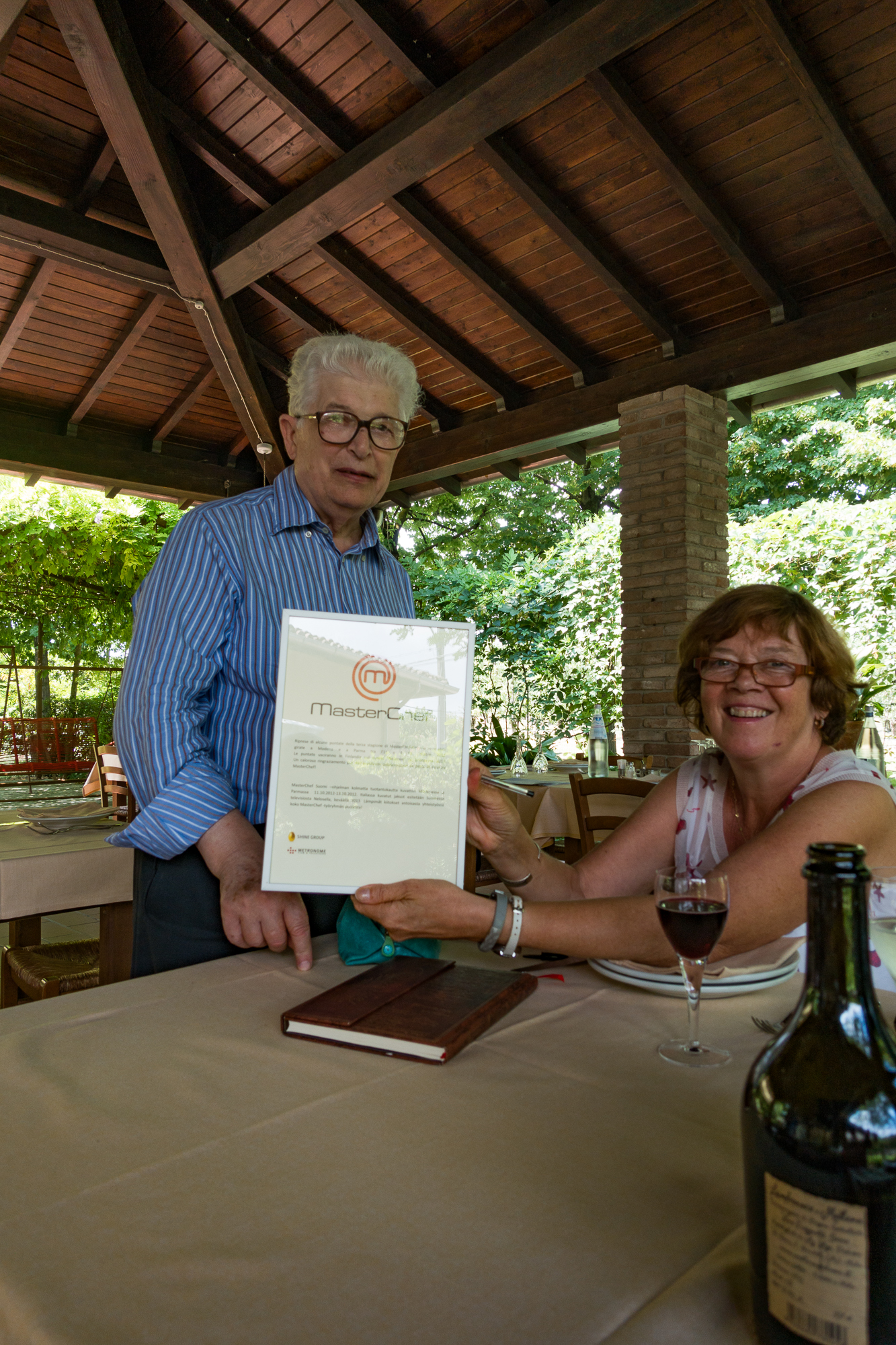 Viini vie ajatukset ruokaan. Yksi suurimmista ruokailukokemuksista on ollut Osteria di Rubbiara, Modenan lähellä. Paikan osoitteessa mainitaan Nonantola, ja se on kuin Ei-Mikään. Eikä se ole edes siellä vaan sen takana, Rubbiarassa, joka kuulostaa hiukkasen sanalta varkaus, ruberia. Poikkesimme osteriassa matkalla Bolognaan jo viime vuonna ja käynti innosti minut kirjoittamaan Pedroneista matkatarinaa ja se vietti minut jopa novelliin. Kuvittelin 1800-luvulla perustetun yrityksen olevan myynnissä. Milanossa investointipankissa puurtava suomalaisnainen saa tehtäväkseen tutustua paikkaan ja tietysti ihastuu sekä vanhaan omistajaan että suun ja vatsan pyöristäviin annoksiin. Kahdeksankymppinen Italo Pedroni pyörii mukana, kehottaa syömään lautasen tyhjäksi,