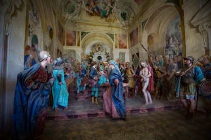 samanarvoisia vai onko keisari paavin yläpuolella. Sveitsin kautta Pohjois-Italiaan kulkeutui kalvinisteja ja heidän ajatuksensa olivat ristiriidassa Ranskasta tulleiden hugenottien käsitysten kanssa. Sekasortoisessa aatteiden tilassa Carlo Milanon arkkipiispana tuki fransiskaanijärjestöä, joiden ideana oli elävöittää ristintietä kansalle. Perustettiin 12 pyhää vuorta ja niiden kappeleihin patsaitten ja maalausten avulla elämyksellisiä kuvia, joiden avulla elävöitettiin jumalan sanaa fransiskaanien näkökulmasta. Olemme useasti ajelleet Varallon ohi pysähtymättä pyhälle vuorelle ja sille vievälle kaapelihissille. Laella 45 kappelissa on jokaisessa yksi raamatun tapahtuma ihmisten kokoisten patsaitten muodostamina kuvaelmina, kaikkiaan 800 patsasta. Varallon pyhä vuori on restauroitu 2003 ja yksi maailmanperintöluettelon kohteista.