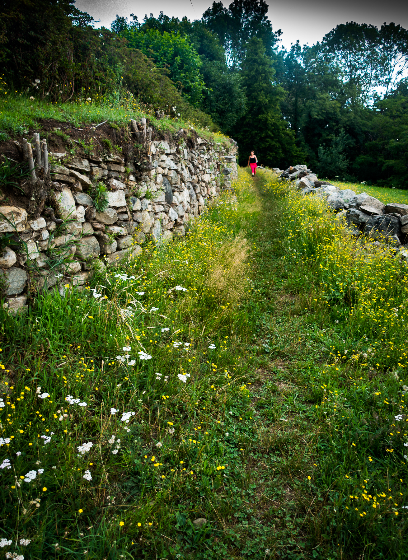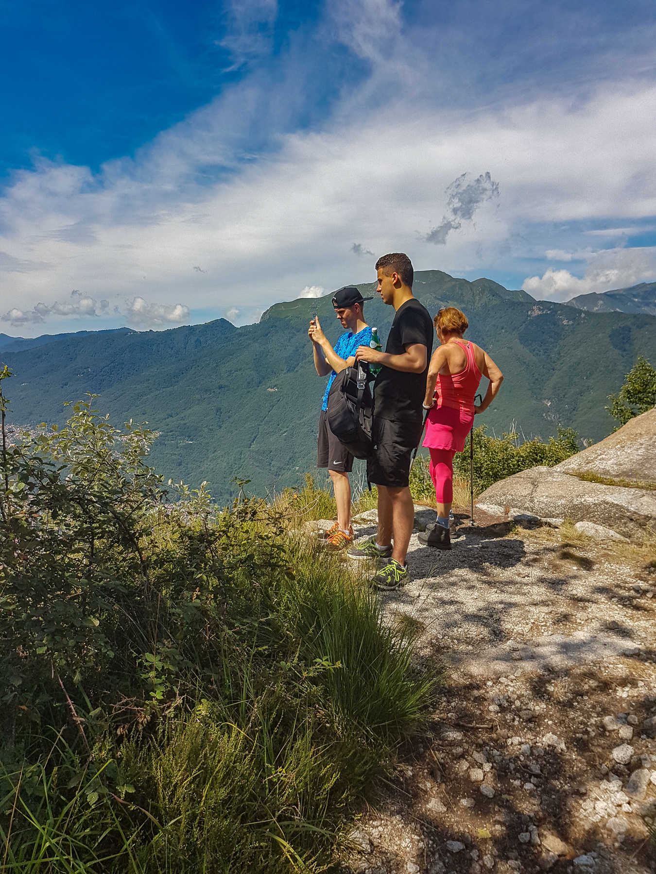 Terassiltamme näkyy järven yli Sveitsin Alpeille. Vasemmassa kulmassa, luoteessa, vuoren rinteitä peittää Italian laajin kansallispuisto. Osa sen poluista on niin huikeita, että vaeltajia kehotetaan turvautumaan paikallisoppaaseen. Naapurimme on johdattanut meidät parille helpohkolle reitille, sellaisille, joille hän uskaltaa ottaa mukaan myös koiransa. Vaikeimmilla poluilla koirat ovat suuremmassa vaarassa lipsahtaa rotkoon kuin ihmiset, joille korkeanpaikan kammo rauhoittaa vauhdin. Jos ja kun vuoren syrjään louhitun puolen metrin levyisen kaistaleen yli vilahtaa satojen metrien pudotus, polvista katoaa helposti tunto. Minä pidän enemmän leveistä kivikkoisista poluista vaikka suoraan ylös.