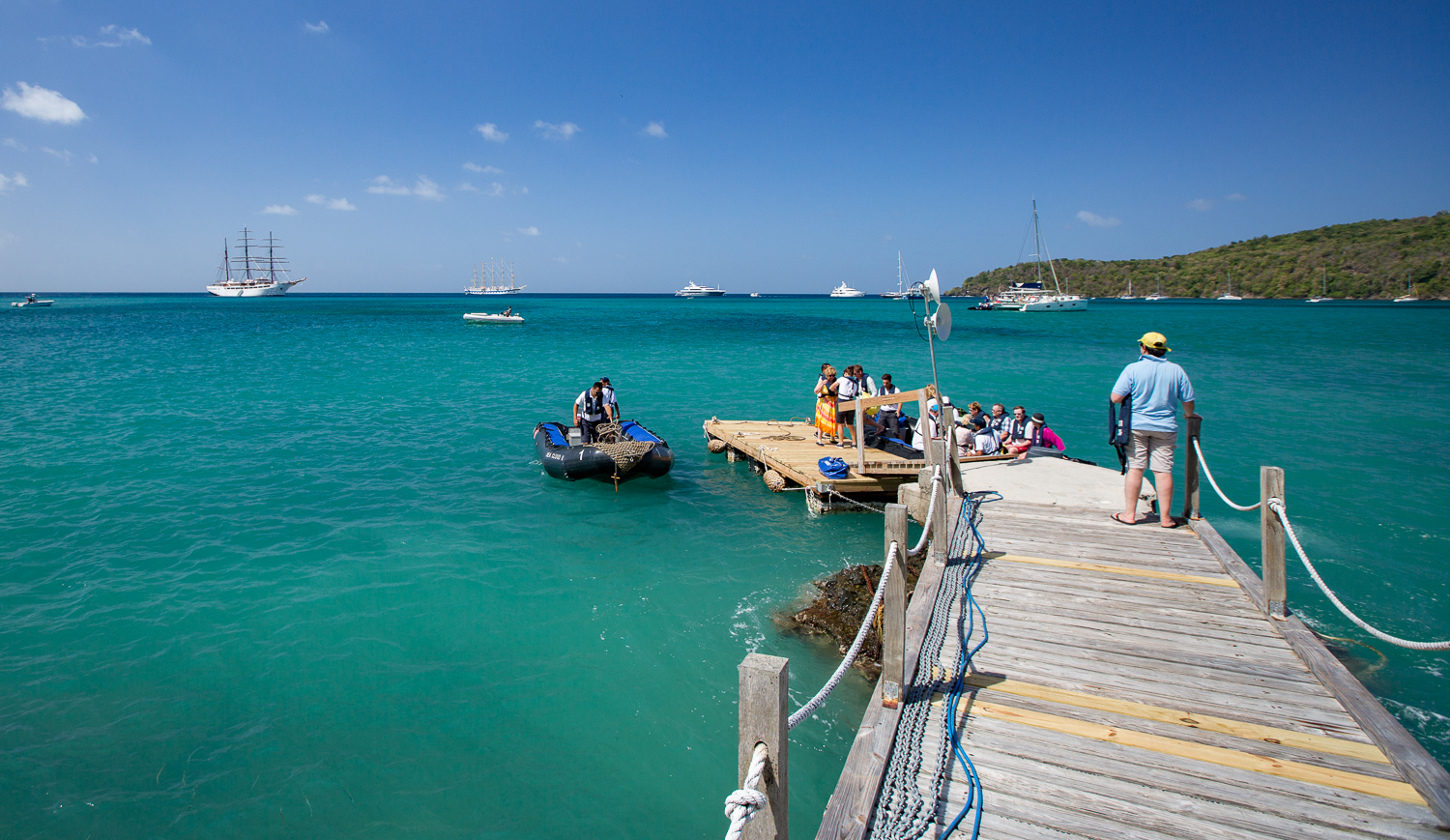 saaren rantaan vyötärön syvyyteen. Se kuuluu Grenadiineihin, muutaman sadan pikkusaaren muodostamaan kokonaisuuteen. Rannan tuntumasta jotkut etsivät koralleja. Moni päätti vain kellua laguunissa kunnes paikallisen toimijan baari kutsui. Rommia ja olutta sai Karibian dollareilla, mikä on saarten yleisimmin käytetty valuutta.
