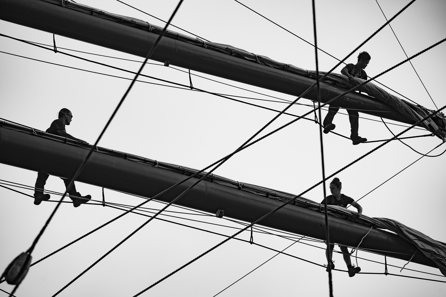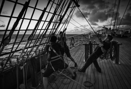 Purjelaivalla saa tuntuman merenkulun historiaan. Miehistö nousee mastoon, tuuli tuivertaa ja mainingit keinuttavat.
