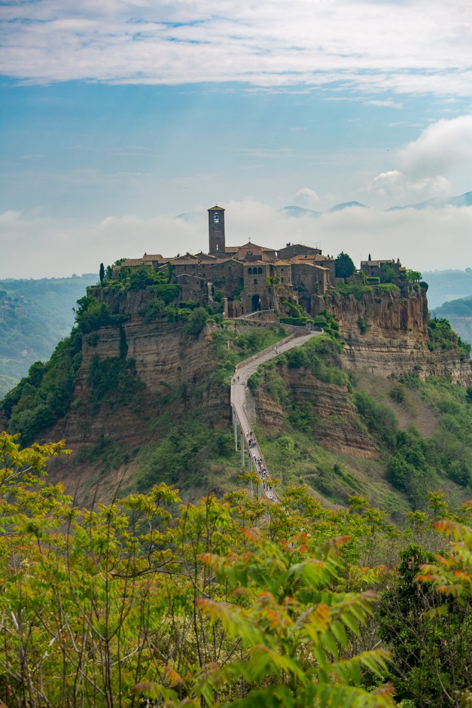 Sähvähdyttävin Ainon meille näyttämistä kohteista on Bagnoregio. Se on turistikohde, muttei ehkä kauaa, koska paikka murenee joka myrskyssä. Tufo-vuoren huipulle keskiajalla rakennettu kaupunki koki rajut tutinat viimeksi lokakuussa 2016. Rapautuvalle vuorelle vie silta, josta avautuu todellinen lintuperspektiivi. Tuomiokirkossa makaa pyhimyksiä, mutta liikuttavin tarinoista kertoo kaupungissa syntyneestä pojasta, joka oli kuolemansairas, kunnes Pyhä Franciscus tuli kylään ja paransi hänet. Ja pojasta tuli aikuisena Boraventura-niminen munkki, joka lähti vaeltamaan Franciscuksen tapaan. Boraventuran talosta on jäljellä enää porras, loput rakennuksesta on rotkon pohjalla. Vain kissa portilla suojelee pyhimyksen kotisijaa.