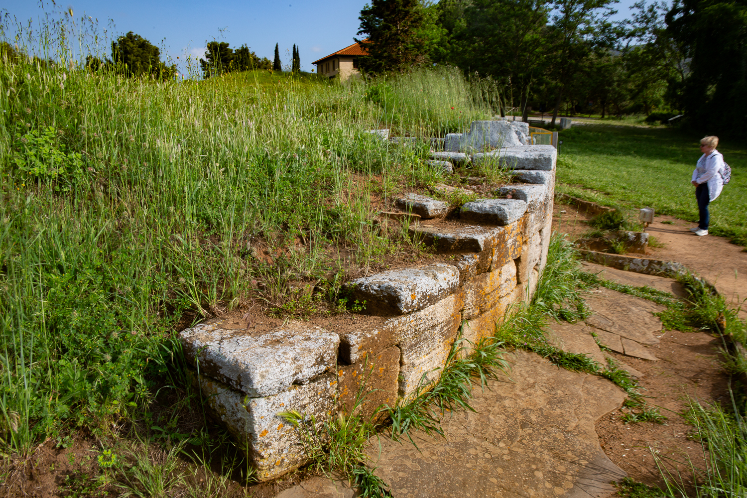 Rosellessa käyskentelemme iltapäivän auringossa roomalaiskaupungin ja etruskikaupungin raunioilla. Ne ovat osin päällekkäin. Epäilemme, että terassilta, jolta maisema avautuu kauas laaksoon, on aikoinaan nautittu virkistäviä juomia sen jälkeen kun on noustu kylpylän altaista. Yrttien tuoksuessa kävelemme ylemmäs etruskien esille kaivettujen asumusten rakenteita tutkiskelemaan. Jotkut oliivipuista ovat vanhoja. Voi hyvin kuvitella etruskien kävelleen juuri sitä samaa harjun polkua kuin mekin, he ovat poimineet keväällä niityltä yrttejä keittoihinsa ja tutkiskelleet oliivipuun kukintoja, kuinka suuri sato olisi tulossa.