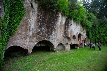 Norchia on kahden harjun rinteeseen rakennetun etruskiasutuksen paikka, jonka harva turisti on nähnyt. Haudat on hakattu luoliksi jyrkimpään rinteeseen, vulkaaniseen kiveen, 500-400 eKr. Löydämme jopa yhden Le Caven, kapean solan. Sen päässä vilkkuu valojuova, muttemme tohdi sisään, pitäisi olla otsalamppu. Päälle rakentuneesta roomalaiskaupungista, Forum Cassii, on jäljellä portti, palanen temppelin holvirakennetta ja jonkin verran linnaa. Sen seinän erottaa vastakkaiselta harjulta ja haudoilta ylöspäin, mutta paikan päällä emme löydä sitä. Ilmeisesti luonto on piilottanut sen. Temppeliraunion kivenkoloista mehiläiset ovat keksineet hyviä pesäpaikkoja, mutta harjun kukkaisniityt tarjoavat pörrääjille niin mehevät antimet, etteivät ne ehdi meitä juuri hätyytellä.