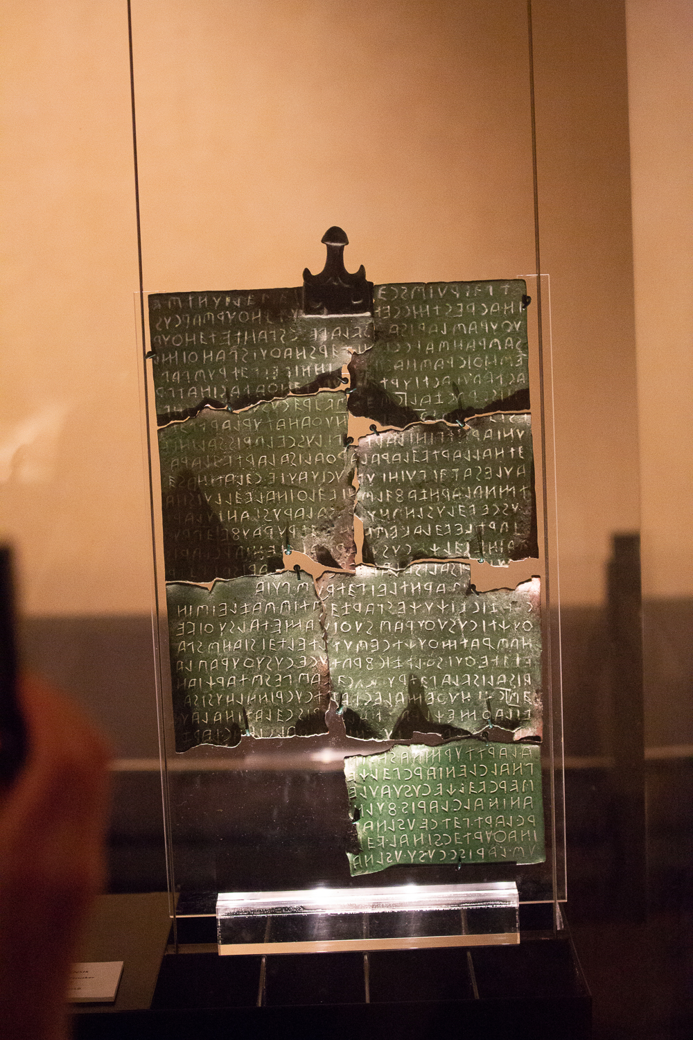 Roomalaiset painoivat etruskit unholaan. Heistä ei jäänyt itse kirjoittamiaan todisteita lukuun ottamatta Cortonan museossa näkemäämme kultaan kaiverrettua kauppakirjaa, jotain pronssilevylle kirjailtua spiraalia ja foinikian ja etruskien kielellä kirjoitettua runoelmaa, joiden tekstit oletetaan samaa merkitseväksi. Jos etruskien paperi oli arvometallia, ei ihme, ettei niitä säilynyt. Ja ehkä jotain vielä löytyy, koska kaivauksia tehdään koko ajan.