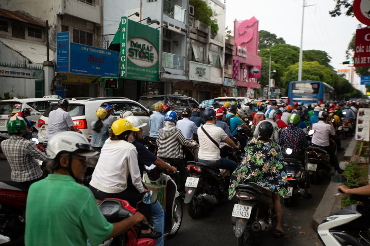 Osasimme odottaa, että liikenne Saigonissa on kaoottisempaa kuin Hanoissa. Järkytyimme silti.