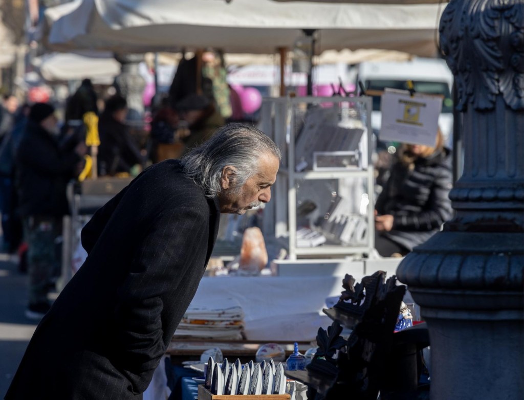 Goethen laskujen mukaan Basilicasta on neljäkymmentä askelta vastapäiselle Capitano-palatsille. Sen neljää pylvästä hän pitää erityisen viehkeinä. Me olisimme halunneet astua palatsin aulaan tai päästä katsomaan pylväiden pintaa kosketusetäisyydeltä, mutta rakennus on jossain virkakäytössä ja rauta-aidalla suojattu yleisöltä. Emme pääse varmistelemaan edes torin leveyden askelmittaa, sillä välikkö on täynnä myyntikojuja. Jokaisen kuukauden toisena viikonloppuna Vicenzan toreilla ja aukioilla myydään antiikkia, tällä keskustorilla arvokkaimpia koruesineitä, kauempana Marzon puistossa huonekaluja ja viime vuosisatojen käyttöesineitä.