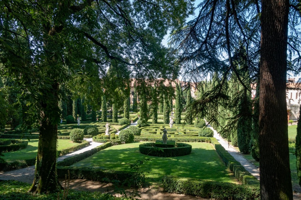 Giustin puutarhaa sanotaan yhdeksi kauneimmista renessanssipuutarhoista, mutta Goethe toteaa sen vähämittaiseksi. Ehkä hän oli nähnyt Versaillesin, jonka geometriset asetelmat jatkuvat silmänkantamattomiin. Siitä tuli 1500-luvulla istutettujen puutarhojen malliesimerkki, jollaisia toteutettiin useiden aatelistalojen edustoille ympäri Eurooppaa. Giustin sypressejä Goethe ylisti, kaikki neulanterävinä korkeuksiin kohoten. Ne antavat todella vastapainoa kallioille. Kesällä 2019 emme tajunneet, että keskimmäinen sypressi portin edustalla oli juuri se, jota hän epäili yli 300-vuotiaaksi ja oli oikeassa, sillä puu eli 600-vuotiaaksi. Vasta nyt kuulemme puutarhurilta, että kesällä 2020 myrsky kaatoi rinteestä viisikymmentä sypressiä. Goethen piirrokseensa ikuistaman puun paikalla on nyt aukko, muut kaatuneista on korvattu uusilla, kynttilämäisillä taimilla. Myrsky teki tavallaan hyvän työn, puutarhuri sanoo, sillä puut olivat yli-ikäisiä. Niihin ei vain hennottu koskea, mutta nyt puutarha uusiutuu. Puutarhuri pyysi meitä tulemaan parin vuoden päästä katsomaan sitä uudestaan.