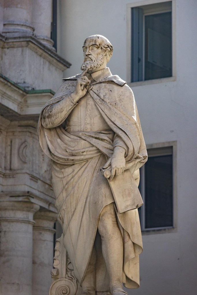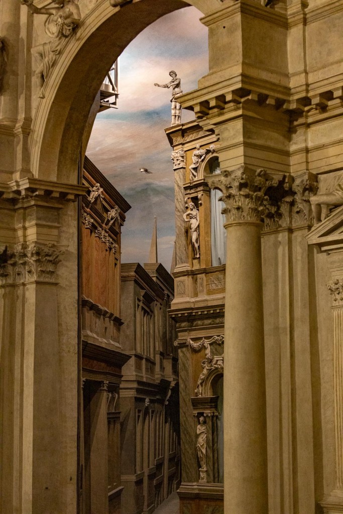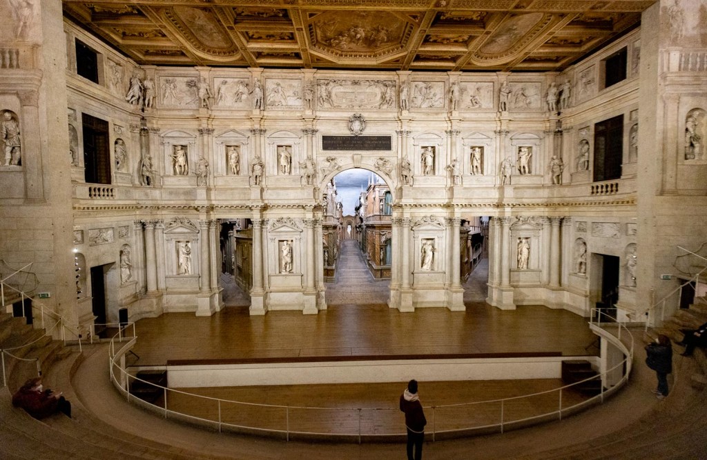 Andrea Palladio syntyi 1500-luvun alussa Padovassa ja teki elämäntyönsä Vicenzassa. Hän innostui jo varhain tutkimaan roomalaisten ja kreikkalaisten rakennuksia Roomassa, mittailemaan niitä, miettimään ihmistä seinien sisällä ja ulkona. Rakennuksen suhteet ympäristöönsä ja tilan olemuksen merkitys niissä liikkuville ovat hänen luomansa peruselementit länsimaiseen arkkitehtuuriin. Jopa Le Corbusier, Alvar Aallon aikalainen ja yksi modernin arkkitehtuurin uranuurtajista, piti Palladiota suurimpana vaikuttajanaan. Andrea Palladion töissä on usein etualalla pilareita, rakennukset ovat kaikki viehättäviä, mutta me suorastaan mykistyimme Teatro Olimpicossa. Se on ensimmäinen teatteri Italiassa, jossa on katto, mutta oleellisinta on sen alle saatu tunnelma. Teatterin ylimmällä rivillä istuessani saatoin kuvitella olevani mukana näytelmässä. Goethe pitää teatterisalia sanomattoman kauniina. Olen samaa mieltä. Sen tunnelma ei alenna ihmistä pieneksi suuruuden keskelle, kuten joku valtaisa kirkko saattaa tehdä, vaan salissa istujan mieli lentää. Voin vain kuvitella kuinka suuri elämys oli teatterin ensi-ilta maaliskuun viidentenä, vuonna 1585. Siellä esitettiin Othello. Kutsuvieraina oli kuninkaita ja ylhäisintä aatelia. Palladio ei ollut enää mukana, sillä hän menehtyi viisi vuotta aiemmin, 72-vuotiaana.