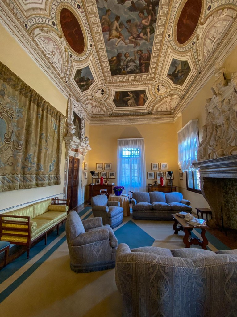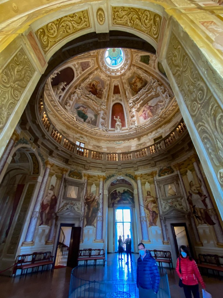 Goethe kutsuu Palladion suunnittelemaa Rotonda-nimistä huvilaa markiisi Capran maataloksi. Ilmaus on satiiria. Rotonda on uhkea valkoinen linna kukkulan laella, ympäristöstään erottuva komeus, mutta sisätiloiltaan Goethenkin mielestä liian huikea ollakseen asunto, maatalo. Palvelusväen asuintilat on kätketty ovelasti rinteeseen, koristeellisen fasadin taakse. Palatsin ikkunoista ei näy kuin fasadi ja katto portilta tulevan tien sivussa. Työläiset olivat keskiajalla orjia, mutta taakse avautuva pylväiden suojassa oleva terassi edusti varmasti sen sarjan asumusten yläluokkaa. Huvilan suunnitelman tilannut Paolo Almerico oli aikansa kulttuuripersoona ja pappi, joka halusi eläköityä Vatikaanista synnyinsijoilleen. Paikka oli Palladion mielestä luonnonkaunis. Sinne pääsi veneellä kaupungista jokea pitkin. Se kiemurtelee tien poskessa rinteen alla edelleen, mutta muutoin maisema on satojen vuosien aikana muuttunut. Voisin kuvitella, että viljapellot lehmusten takaa jatkuivat kauemmas, nyt teollisuusrakennukset ja ostoskeskukset häämöttävät horisontissa. Eläkeläispappi ja arkkitehti eivät nähneet palatsia valmiina, sillä sen huoneiden massiiviset lasimaalaukset, kultakoristukset ja freskot syntyivät vuosikymmenten saatossa. Papin poika myi talon Capran veljeksille, joiden jälkeläiset myivät sen edelleen vuonna 1911 Valmaranan-suvulle. Rakennus on yleisölle auki viikonloppuisin aamupäivinä, joten meillä kävi tuuri. Osuimme sattumalta sen aukioloaikaan. Rotondan ylenpalttisuus on niin raju kokemus, että lähellä olevaan toiseen Valmaranan huvilaan ei samana päivänä pysty. Siellä olisi ollut kuuluisian Tiepolon freskoja, Goethe muistuttaa. Mutta jääköön, sillä hänen mielestään taiteilija pääsi toteuttamaan itseään rajatta, osaksi onnistuen ja ylevyyteen yrittäessään heikommin.