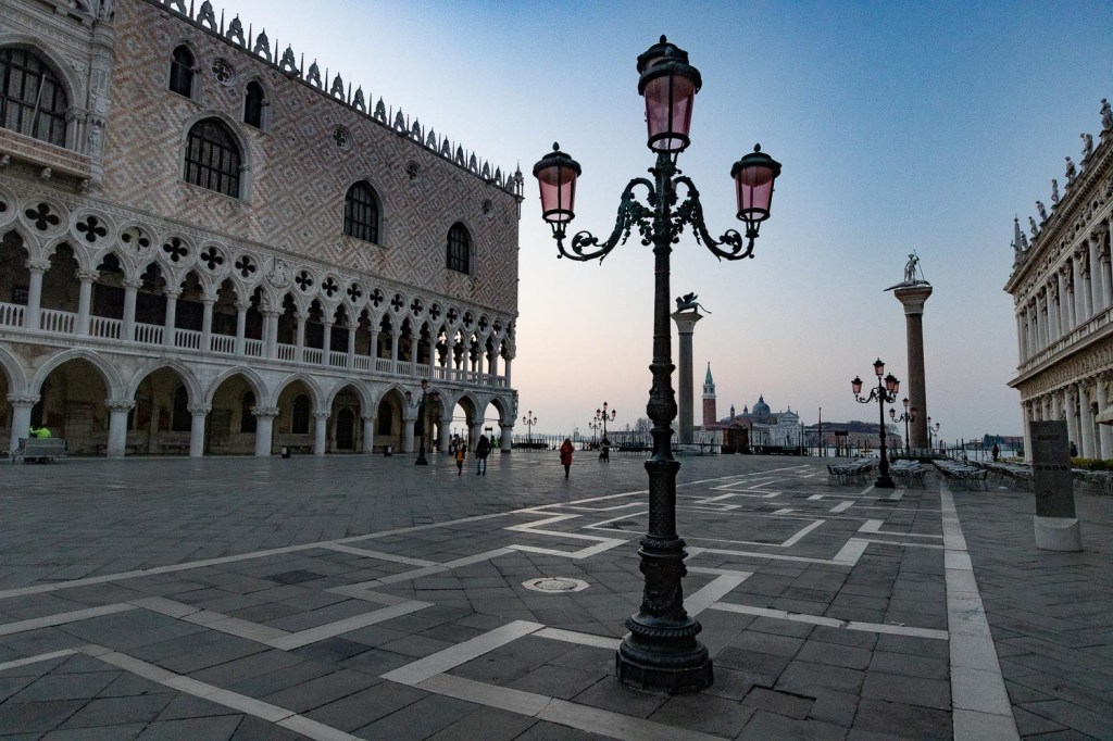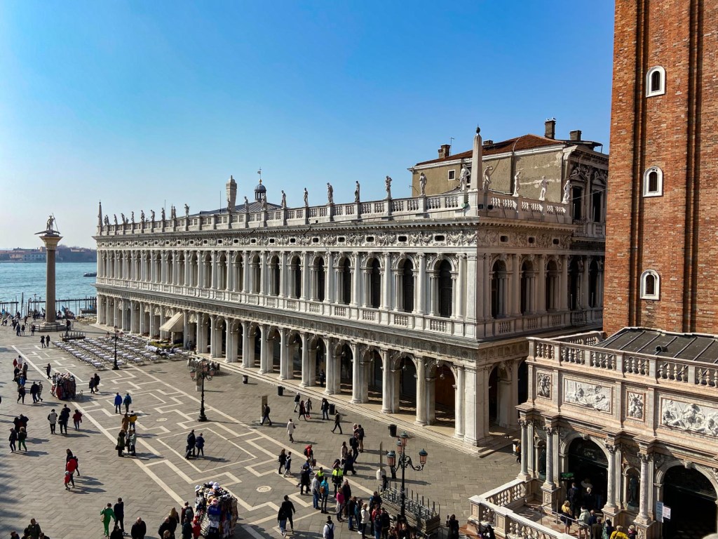 Kirkon katolta avautuu maisema kellotorniin ja torille. Näkymä kahden pylvään välistä laguuniin on satumainen. Vasemmalla Dogen palatsi, jonka tällä matkalla jätämme väliin, edessä San Giorgon ja Giudeccan saaret, oikealla kirjastorakennus, Biblioteca Marciana, jonka sisätiloja ja upeita patsaita Goethe ylistää, mutta jonne korona-pandemian vuoksi me emme pääse.