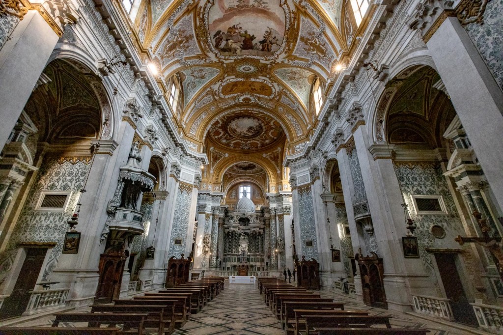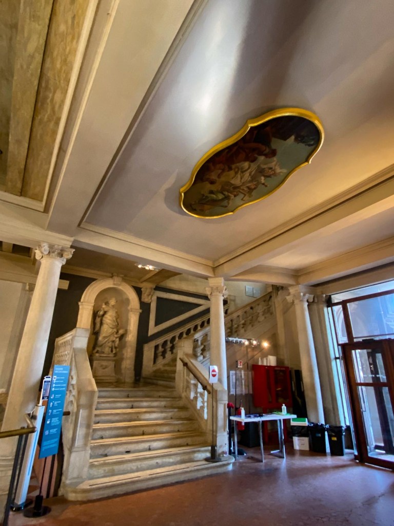 Toisenlainen lajissaan on jesuiittakirkko, jonka toiminta oli jo silloin pannassa. Goethe kuitenkin pääsi sisälle ihailemaan Tiepolon maalauksia kirkon katossa. Niiden pyhimysten nilkkojen lisäksi Goethe on näkevinään helmojen alta pilkahtavan muutakin. Häntä maalaukset naurattavat, mutta hän ei mainitse mitään taidokkaista seinien vihreillä ja vaaleilla marmorilaatoilla toteutetuista pinnoista. Saarnastuolin verhoa luulen ensin aivan muusta materiaalista tehdyksi, mutta marmoria sekin on.