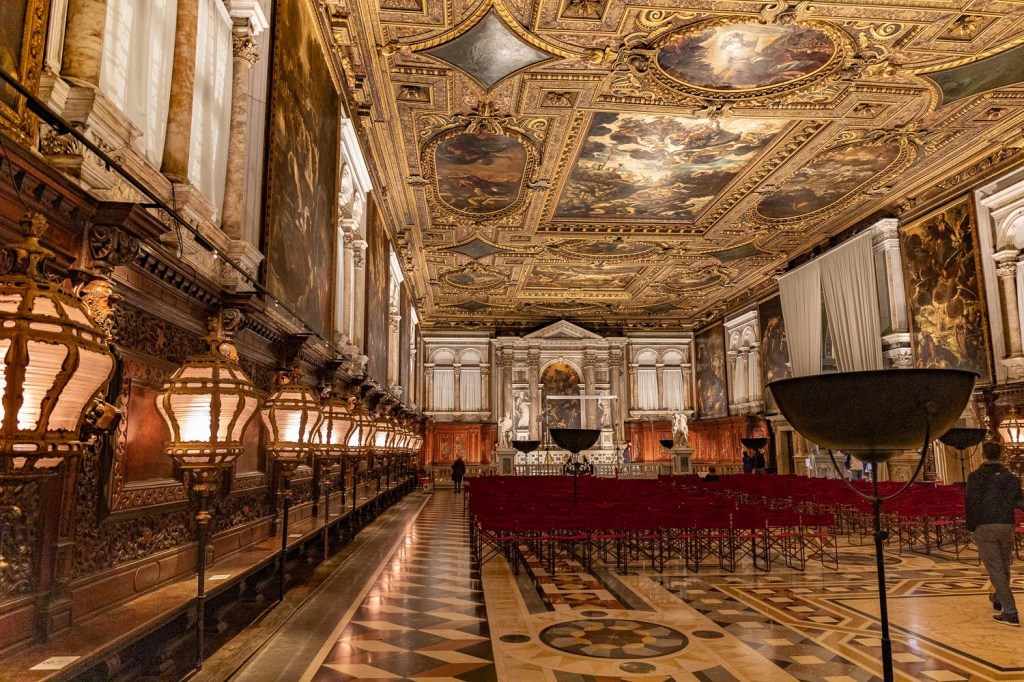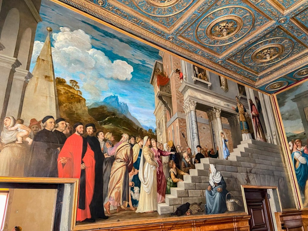 Tintoretton teoksien fanfaari löytyy Scuola di San Roccosta. Scuolat ovat rakennuksia, jotka kuuluvat eri ammattikunnille. He eivät olleet aatelisia, joiden joukosta valittiin hallitsija, mutta heillä oli suuri merkitys kaupungin elinkeinoelämälle ja jotkut ammattikunnista olivat myös hyväntekijöitä, kuten tämä Roccon veljeskunta. Ruttoepidemian jälkeen se rikastui ylenpalttisesti, koska rutosta pelastuneet kiittivät lahjoin Pyhää Neitsyttä. Rakennus on komea barokkilinna, olematta mikään rakennustaiteen mestariteos, Goethe toteaa taas tyypilliseen sarkastiseen tapaansa. Me äimistymme valtaisten freskojen keskellä. Goethen mielestä ne ovat hyvin suunniteltuja, mutta pienempinä ne olisivat miellyttävämpiä katsella. Hänestä minkä teoksen vaikuttavuus ei ole koosta kiinni. Henkilöhahmot ovat ilmestyneet Tintorettolle, jos niin saan sanoa, pienemmässä koossa, hän on vain mittakaavan mukaan niitä suurentanut, voimatta suurentaa sisäistä luontoa. En lähde kiistelemään Goethen kanssa, vaikka San Rocco jättää minuun ikuisen muistijäljen.