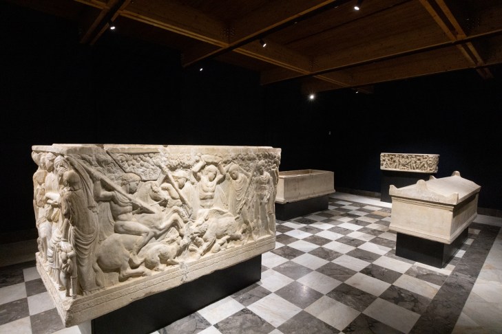 Nykyisin sargofagi ei enää ole alttarina vaan sille on annettu yksi katedraalin sivukappeleista. Jossain vaiheessa historiaa sen alastomien miesten sukuelimet peitettiin yleisöltä. Nuoret pojat vaikuttavat lapsekkailta. Heidän intonsa lähteä metsästysretkelle välittyy katsojalle. Goethe on poikia toistakymmentä vuotta vanhempi, mutta vielä nuori. Hän tulkitsee naishahmon tässä teoksessa sivuseikaksi. Minä taas näen reliefissä tuskan: nainen ottaa vielä keskenkasvuista intoa täynnä olevaa rakasta lastaan käsivarresta ja sanoo älä lähde. Aivan uskomattoman taitava teos kahdentuhannen vuoden takaa.