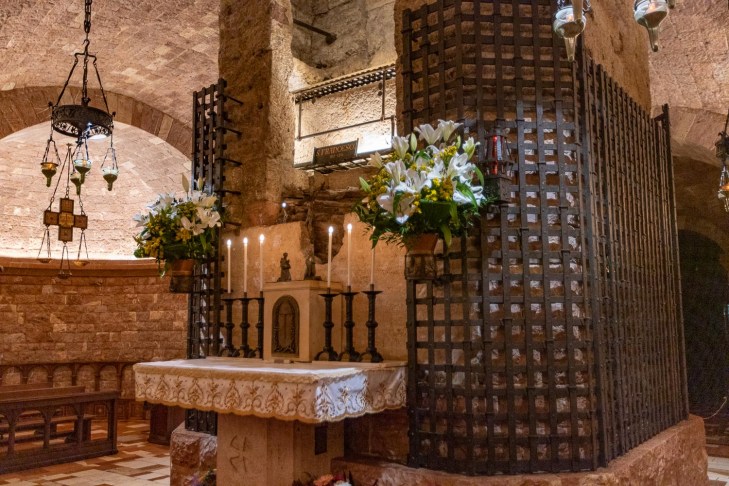 Matkakumppanimme mainitsee, ettei käynyt katsomassa Pyhän Fransiskuksen hautaa, koska ei halunnut turmella siitä mielessään muodostamaansa kuvaa. Meistä hauta on yksinkertaisuudessaan kaunis, sillä kappelia ei ole koristeltu kuin tuorein kukkasin. Rikkaan kauppiaan poika pisti nuorena ranttaliksi, mutta heräsi vähän yli kaksikymppisenä uskoon ja hylkäsi kaiken mammonan ja koreuden. Hänellä oli aina ollut paljon ystäviä ja sana hallussa, joten hänen raamatuntulkintaansa kuunneltiin. Myös ylipapit alkoivat suosia häntä, sillä erilaisia lahkoja oli syntynyt monia ja uskontokuntien yhdistämistä tarvittiin. Fransiskuksen näkemys maailmasta perustui ihmisen ja luonnon väliseen rauhaan ja kunnioitukseen. Basilikan edustalle pystytetty patsas kuvaa uupunutta saarnaajaa. Hänen kirjallinen tuotantonsa oli hurjatahtinen ja silti hän ehti vaeltaa ja saarnata kunnes jo nelikymppisenä sairastui ja menehtyi.