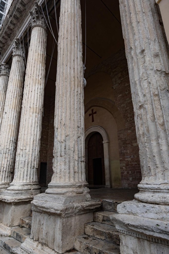 Vihdoin tulimme varsinaiseen vanhaan kaupunkiin, sen torille, ja katso: siinä seisoi tuo kaunis pyhä rakennus. Ensimmäinen näkemistäni antiikin töistä. Niin vaatimaton temppeli kuin pikkukaupungille sopi, mutta silti niin eheä ja sellaiseksi ajateltu, että se saattaisi sijaita missä tahansa. Ensiksikin tuo temppeli sijaitsee vuoren laella, joka yhä vielä on torina: siinä juuri yhtyy kaksi kukkulaa, itse paikka eli tori kohoaa hiukan, ja siinä yhtyy myös neljä tietä, joista syntyy hyvin matala Andreaan risti. Kaksi tietä alhaalta ylös, kaksi ylhäältä alas. Todennäköisesti ei temppeliä vastapäätä entisaikaan ollut taloja, se on suunnattu suoraan etelään, ja jos nyt kuvittelee talot pois tieltä, oli näköala sieltä mitä ihanin. Teiden on täytynyt olla jo vanhastaan olemassa, enemmän tai vähemmän, sillä ne noudattavat vuoren omaa sijaintia. En käsittänyt, miksi temppeli ei ollut keskellä toria, mutta vihdoin sen keksin. Roomasta lähtevä ajotie oli, kuten oletan, jo rakennettu, ja rakentajamestari pystytti temppelin siten, että se olisi tieltä katsoen nähtävissä. Fasadi on korinttilaisen järjestelmän mukainen, pylväät silmämitalla noin kahden pylvään läpimitan etäisyydellä toisistaan. Pylväissä jalat ja kuutiokannat. Sitten jalustat, viisi askelmaa johtaa pylväiden välistä ylös. Viisi, koska antiikin rakentajat laativat askelmat aina parittomiksi.