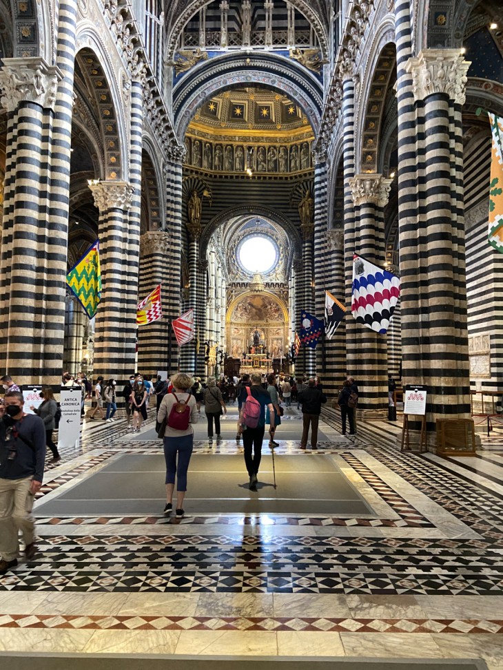 Goethe pysähtyy Sienassa vasta lähtiessään kotiin Saksaan. Ehkä hän on jo siinä vaiheessa uupunut matkasta eikä jaksa enää kirjoittaa rakkaalleen Weimariin. Sitä paitsi kahden vuoden aikana taisi tulla ryppyjä rakkauteen, sillä Goethellä oli tyttöystävä ainakin Roomassa. Sienan Duomo on yksi niistä kirkoista, jotka Italiassa on nähtävä. Uskomme että Goethe pistäytyi sisällä, vaikka hän mieluiten tutkii rakennusten arkkitehtuuria ulkopuolelta. Sienan duomon freskot ovat ainutlaatuiset, sillä vielä 1200-luvulla Siena oli oma valtionsa ja taiteilijat kehittivät oman tyylinsä kuvata raamatun tapahtumia freskoihin. Ne ovat lempeitä ja siksi mieltä rauhoittavia katsella. Donatellon veistämät patsaat ja reliefit keräävät turistilaumoja ympärilleen. Tosin näin huhtikuun lopulla ja pääsiäisen jälkeen matkalaisia on vähemmän kuin tavallisesti. Piazza Il Campolla on vain pari matkamuistokojua ja väljyyttä ihailla tuota ihmeellistä ellipsin muotoista aukiota, jonka toinen puoli on korkeammalla kuin toinen. Kuuluisa hevoskilpailu, Palio, järjestettiin ympäristön linnajoukkueiden kisojen 2.7-16.8 lopuksi myös Goethen aikaan, niistä hän mainitsi, mutta ilmeisesti joutui tyytymään johonkin vähemmän tunnettuun hevoskilpailuun Roomassa.