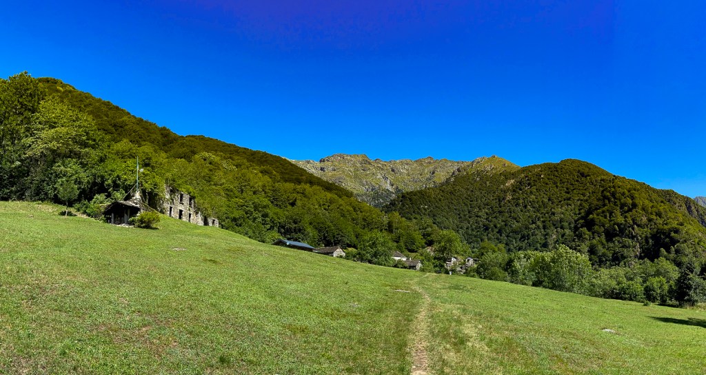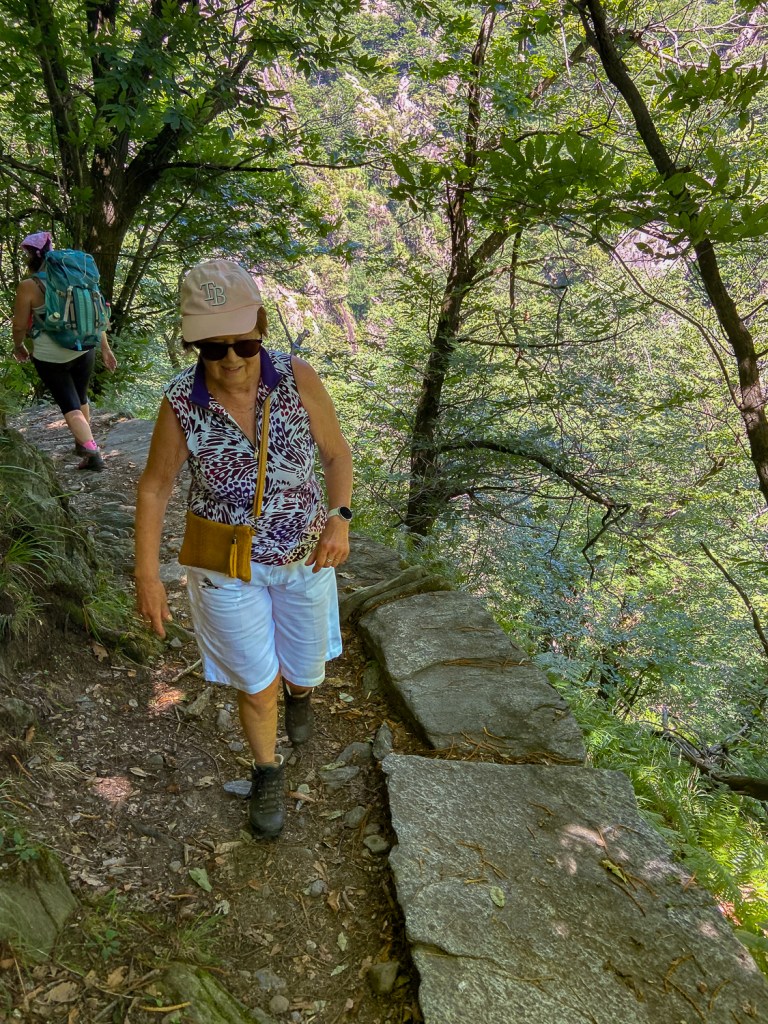 Patikkaretki Cicognasta Pogalloon vie runsaat puolitoista tuntia suuntaansa ja levähdys lähteellä vartin. Kyllä siellä viihtyisi pitempäänkin, mutta kun tarjolla ei ole ruokaa, on palattava. Polku on pengerretty vuoren seinään – gneissiä se on, Italiassa harvinaista, Suomessa yleistä. Aurinko paistaa ja puiden oksat pilkottavat täpliä kivikkoiselle tai juurten peittämälle pinnalle.