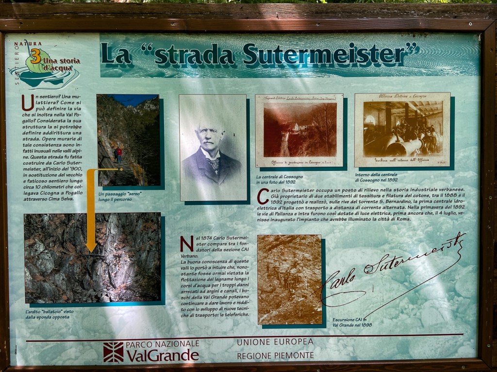 1800-luvun loppupuolella Maggiore-järvelle, Pallanzaan, saapui sveitsiläismies Karl (Carlo) Sutermeister. Hänen isänsä oli vaurastunut kehruukoneilla ja perustanut ensimmäiset tekstiilitehtaat Italian Bielaan, josta suurimmat ja tunnetuimmat italialaiset vaatebrändit ovat saanet alkunsa. Carlo ihastui järviin, vuoristoon ja paikalliseen aatelistyttöön. Hän löysi Pogallon ja sen ympäristön sankat metsät. Niiden hyödyntämiseen tarvittiin paitsi työvoimaa niin myös sahalle sähköä, jonka tuottamiseen hän vangitsi vesiputouksen ja perusti yhden Italian ensimmäisistä vesivoimaloista. Sähköä tarvittiin myös kaapelihissiin, jolla puutavara kuljetettiin Cicognaan ja sieltä hevoskuormissa Maggiore-järven rantaan. Duomon rakentamisessa käytetty puutavara tuli Pogallosta. Vuonna 1890 kylässä vallitsi kultakuumeen tunnelma. Neljänsadan työntekijän perheillä oli koulu, lääkäri ja poliisiasema. Putkaakin tarvittiin.