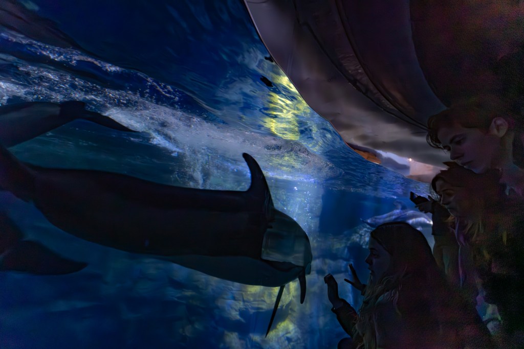 Kaiyukan eli Osakan akvaario oli elämys. Me saimme kävellä vähintään kolmen kerroksen verran sen jättimäisen vesisäiliön ympäri ja ihmetellä maailman eri merien eläimistöä, huvittua pingviinien pelleilystä, häikäistyä valaiden kokoa, seurata delfiinien leikkejä ja kummastella pohjakalojen möröttelyä. Jotkut kaloista elivät symbioosissa keskenään ja jotkut oli eristetty verkoin omiin alueisiinsa. Reijo sai muutamia loistavia kuvia.