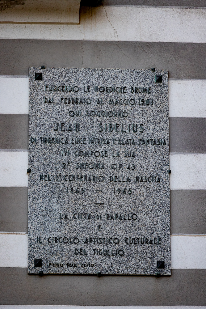 Jean Sibelius oli aloittanut toisen sinfoniansa työstämisen Suomessa ja jatkanut sitä Berliinissä. Rapallossa perhe asui Pension Suisse -nimisessä majatalossa. Aino opetti lapsiaan, kaikkia neljä ensimmäistä vuotta. Hänen ja lasten äänet häiritsivät säveltäjää. Pitkillä kävelyretkillä rantaviivassa pohjoiseen, Portofinoon ja etelään, Zoagliin, Sibelius mietti sävelkulkuja ja nautti meren pauhusta. Se kuuluu selvästi toisessa sinfoniassa. Kirjoitustyöhön Sibelius vuokrasi huoneen Rapallon yläpuolelta, Villa Molfinosta, jonne oli puolen tunnin kävelymatka aamuin illoin. Tunnemme myös Juhani Ahon ja Venny Soldanin suoran jälkeläisen, joka kertoi kävelleensä Satu Jalaksen kanssa Federico Ermirion johtamana talolle. Sieltä näkymä merelle metsäisessä maisemassa mutkittelevan jokiuoman yli on vertaansa vailla.