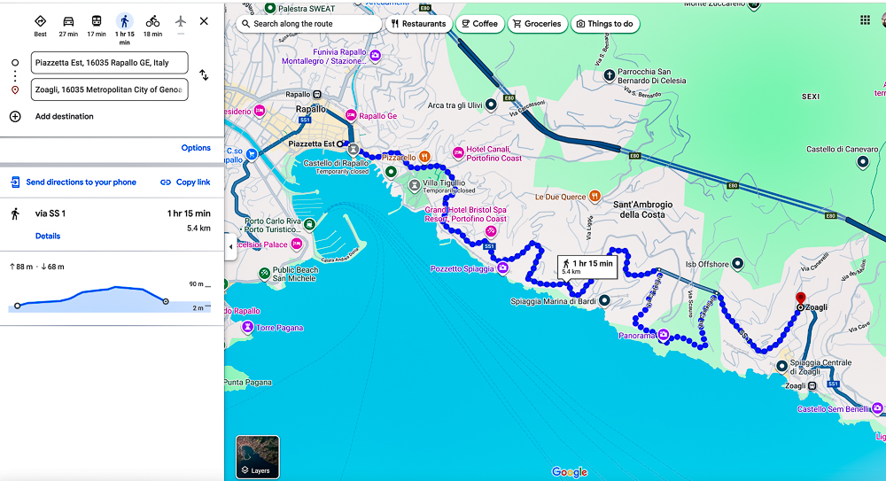 Kun olimme nauttineet Via Francigena -kävelyretkestämme Toscanassa, mietimme missä voisimme pysähtyä yöksi kotimatkan varrella ennen Stresaa. Ligurian rannikko osui kartalta heti silmiimme. Genova on suuri satamakaupunki, upea kyllä, mutta siellä pitäisi viettää päiviä. Portofino taas Italian Rivieran helmenä on kallis yöpymispaikka, Santa Margheritassa olemme viettäneet muutaman hauskan illan ja yön ystäviemme kanssa vuosia sitten, mutta Rapallo on tähän asti ollut pelkkä läpiajokohde moottoritieltä matkalla Portofinoon.