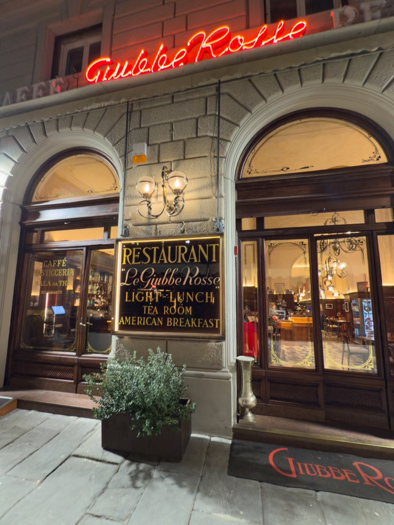Löydämme vapaan pöydän Le Giubbe Rosse-ravintolasta Piazza della Repubblicalta. Kun Firenzestä tuli viideksi vuodeksi pääkaupunki vuonna 1865, yrittäjät eri puolilta Eurooppaa ryntäsivät uuteen kuningaskuntaan. Itävaltalaiset avasivat tällä paikalla Reininghaus -nimisen ravintolan. Nimi oli italialaisille vaikea. Tarjoilijoiden punaiset takit erottuivat muista ja niin paikkaa alettiin kutsua punaisten takkien kuppilaksi. Ravintolasta tuli pohjoismaalaisten, saksalaisten ja englantilaisten taiteilijoiden ja kirjailijoiden kantapaikka, koska siellä oli tarjolla kansainvälisiä lehtiä. Vuonna 1898 Elin ja moni muu seurasi Nya Presseniä, jonka artikkelit pitivät heidät tietoisina Suomen tapahtumista. Pari vuotta myöhemmin Eero Erkon ja ystäviensä nuorsuomalaisten perustama Päivälehti sai päivänvalon.