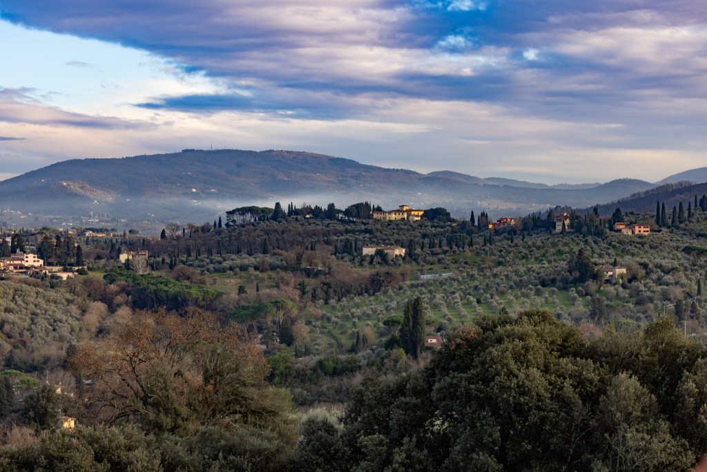 Ahot asuivat Firenzessä vuosina 1903-1904 vielä korkeammalla Arnojoen eteläpuolella kuin Gallenit aikoinaan. Juhani Aho muutti perheineen Italiaan, koska pystyi kirjoittamaan vapaammin Suomen ulkopuolella. Ylvan isoisä Heikki oli silloin 8-vuotias. Pihapiiri päättyy molemmilla puolilla kukkulaa maalaismaisemaan, oliivipuulehtoihin, joissa Heikki ja Antti ovat juoksennelleet leikeissään. On mahtavaa, että Italiassa edelleen arvostetaan paitsi vanhaa rakennuskantaa niin myös maisemaa. Rinteitä ei täytetä kerrostaloilla, vaan ne säilytetään sukupolvelta toiselle.