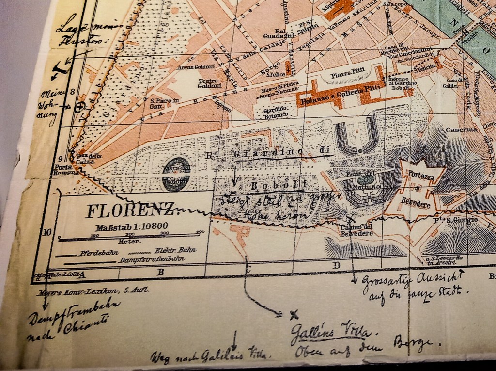 Taidekriitikko Öhquist tuli tapaamaan suomalaisia taiteilijoita Firenzeen maaliskuussa 1898 ja merkitsi karttaansa nuolen Gallenin huvilaan.