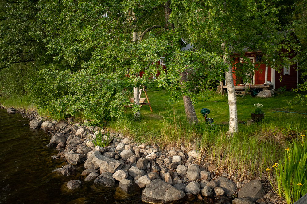 Lopuksi mäentöyräs järven rannassa, alla rakennusrivi kuin pienoinen riviera, venevajasta kalanperkuukatokseen, puuceehen, liiteriin, saunaan, aittaan ja huvilaan. Vastarannalla ei näy ketään. Rantakalliot muistuttavat puustoineen ja pensaikkoineen Pohjanlahden poukamia, kotiseutuni Ahlaisten rannikkoa, paitsi että niiden vedenrajassa ei ole vehreyttä, kanervikkoa ja poronjäkälää kuten täällä. Rauha.