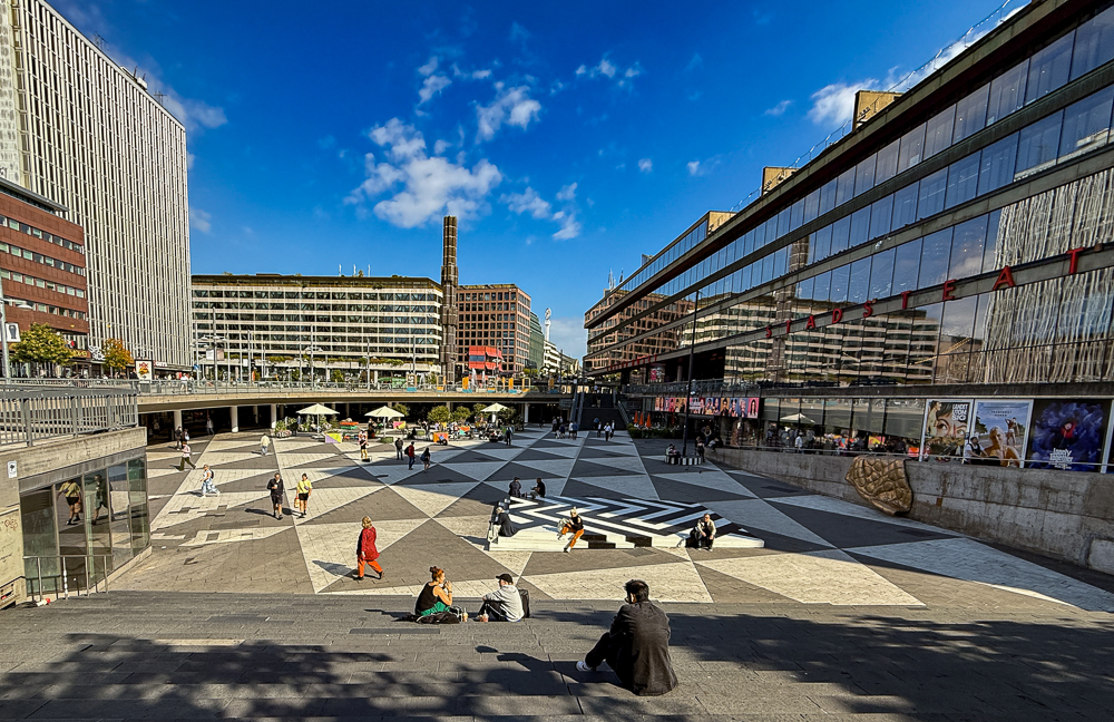 Matkanjohtaja on suunnitellut meille tutustumiskävelyreitin. Kaivokatua Kuningatarkadulle, kävellään Åhlensin tavaraton ohi. Sieltä ostin talvella 1981 harmaan villapuvun, jota käytin vuosia. Kruunuhaan jugend-kotimme turkiskuoriaiset tuhosivat sen lopulta. Käväistään Heinätorilla, muistan joskus ihastuneeni sen possu- ja rinkelitunnelmaan joulun alla. Siitä on kohta 40 vuotta. Sergelsin torilla matkanjohtaja kertoo hurvitelleensa nuorena. Komea aukio. Kuninkaanpuutarha muistuttaa kaukaisesti Helsingin Espaa. Sen lehvistön suojassa nautimme sunnuntain rauhasta, kunnes huomaan, että on keskiviikko. Kuninkaanpalatsi näyttää yllättävän vaatimattomalta harmautensa vuoksi. Tukholmassa on jotain samaa kuin Hollannin Haagissa ja Italian Torinossa. Ne on rakennettu samoihin aikoihin, 1800-luvulla. Niin myös Helsingin ydin. Vanhankaupungin kujat jätämme toiseen kertaan. Matkanjohtaja naputtaa tilauksen Überille, 130 kruunua ja olemme laivalaiturissa.