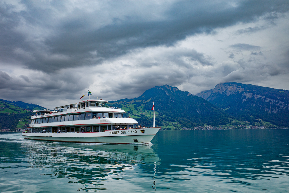 Patikoimme asemalta jyrkännettä alas rantaan. Puhtautta ja täydellisyyttä kuten vain Sveitsissä. Jopa maitosuklaanruskeat vuohet rinteillä ovat kuin juuri suittuja. Järven risteilyalukset koko- ja laatuluokassaan monin verroin komeampia kuin Lago Maggiorella. Nautimme lounaan, menu ranskaksi ja englanniksi, tarjoilija puhuu saksaa ja italiaa. Kaikkea osataan, mainiota ruokaa, espanjalaista kuohuviiniä, portugalilainen viini olisi ollut edullisinta mutta ehkä juuri siksi se oli loppu.