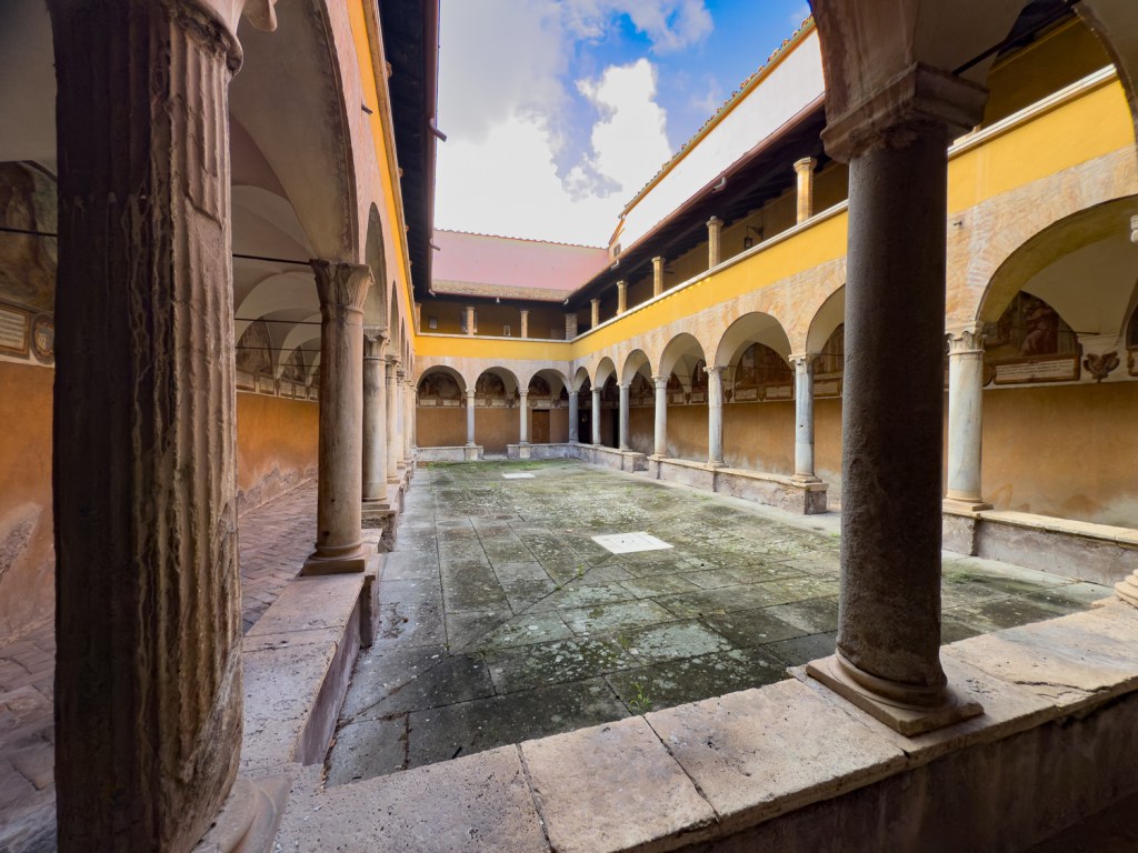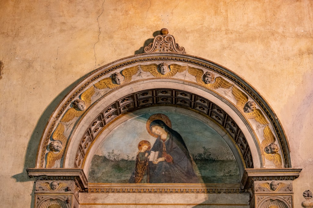Sant’Onofrio luostariin yritimme jo vuosia sitten kun seurasimme Goethen jalanjälkiä työstäessämme kirjaamme Italiaa ristiin rastiin. Luostari on Gianicolon kukkulan rinteellä vain muutama sata metriä Suomen kulttuurikeskuksesta, Villa Lantesta. Sant’Onofrion piti olla nettisivujen mukaan auki arkisin klo 10-12, mutta Italiassa nettitiedot valitettavan harvoin pitävät paikkaansa. Egyptissä 400-luvulla eläneen Pyhän Onofrio -erakon elämää kunnioittava luostari kiinnosti Goethea. Se on rakennettu 1400-luvulla ja sen pihapiiri ja pilariholvi näkyvät suljetun rauta-aidan läpi. Tällä kertaa soitimme ovikelloa. Miesääni vastasi: Ei, emme ole nyt auki, vaan vasta huomenna kello 9. Niinpä Reijo heräsi varhain. Halusimme nähdä Madonna ja Lapsi -teoksen, josta Venny Soldan-Brofeldt maalasi kopion ensimmäisellä miehensä Juhani Ahon kanssa tekemällä Rooman matkallaan vuonna 1893. Arvata saattaa, portti oli kiinni. Sattumalta joku, mahdollisesti munkkioppilas, tuli rakennuksesta ulos ja Reijo pujahti pihaan. Hänen tarinansa kirjaprojektistamme ja sitkeydestämme tehosi, sillä kaveri lähetti kännykällään viestin rehtorille. Muutaman minuutin kuluttua lukkari saapui paikalle ja totesi, että vasta kymmeneltä ovet avataan, mutta Reijo sai armon ja pääsi kirkkoon kuvaamaan. Löytyihän se, teos, jota aikanaan luultiin Leonardon da Vincin maalaamaksi.