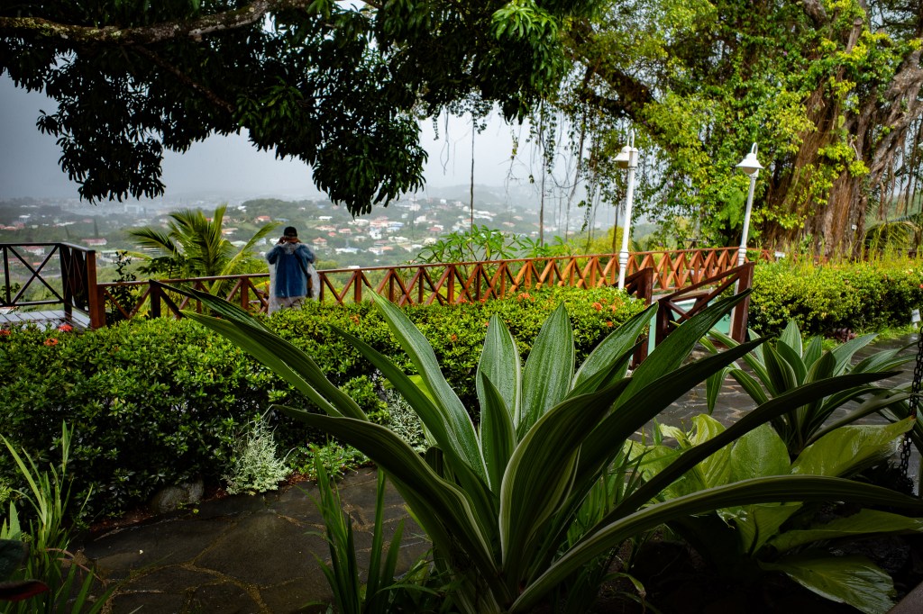 Saint Lucian saari on tuttu vulkaanisesta toiminnastaan, parista terävähuippuisesta vuoresta, pitoneista, kiehuvasta mutalähteestä ja vesiputouksista, joihin tutustuimme muutama vuosi sitten ensimmäisellä risteilyllämme Silver Cloud -purjelaivalla. Tästä linkistä pääset siihen ehkä elämämme huikeimpaan merimatkaan. Tällä kertaa pysähdyimme Rodney Bay -satamassa ja ajelimme bussilla saarella vaikuttaneen lääkärin huvilalle. Sinänsä mitäänsanomaton kohde, kaunis puutarha, jota emme oikein nähneet, koska satoi. Kylien talojen värikkyys jäi kyllä mieleen. Talot on rakennettu rannassa pilareille, aivan kuin Floridassa. Jos hyökyaallot lyövät, asuintilat saattavat pysyä kuivina. Ylempänä vuorilla pilareita ei enää näkynyt.