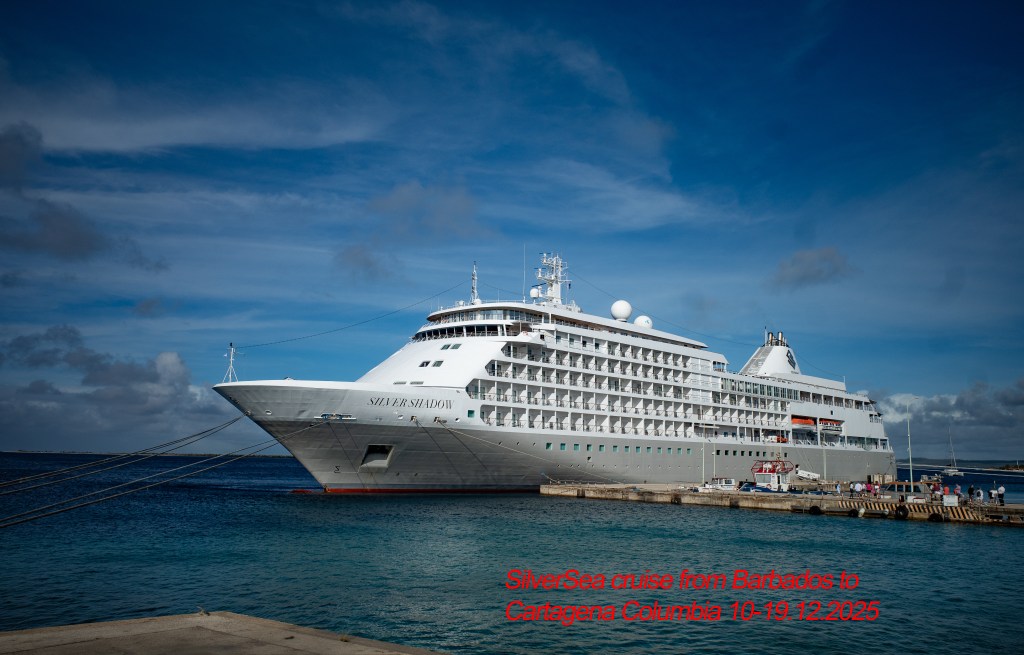 Lauantaina 13.12 nousimme Silver Shadow -nimiseen laivaan 320:n muun matkustajan kanssa. Saimme oman hytin ja parvekkeen, jota emme juuri käyttäneet muutoin kuin uima-asujemme kuivatukseen. Laivalla oli tilaa ja niin vähän matkustajia, että kasvot ja muutamat nimet tulivat tutuiksi 9:n päivän aikana. Koska liikuimme varsin lähellä Venezuelaa, tiirailimme välillä horisonttia mitään erikoista näkemättä. Baarissa tutustuin Venezuelasta 20 vuotta sitten Yhdysvaltoihin muuttaneeseen pariskuntaan. Mies sanoi olevansa María Corina Machado Pariscan serkku ja ihailevansa tämän Nobel-rauhanpalkinnon saaneen naisen rohkeutta. Hän uskoi Venezuelan poliittiseen muutokseen.